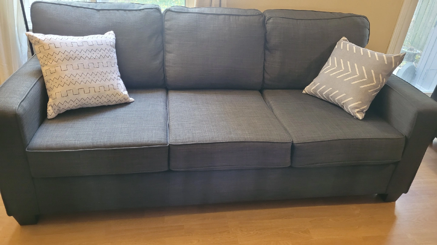 10Selling a comfy three-seater sofa in a neutral grey colour! It's in great shape and would look lovely in any living room. Comes with two decorative pillows to complete the look. Perfect for lounging and relaxing after a long day! I have never used the pillows and have always stored safe in my cupboard. It is good as new! I'm selling my home furniture as I'm moving. All pieces are about a year old and in excellent condition — well-maintained and kept covered. Prices are negotiable, and it’s a great deal for buyers!