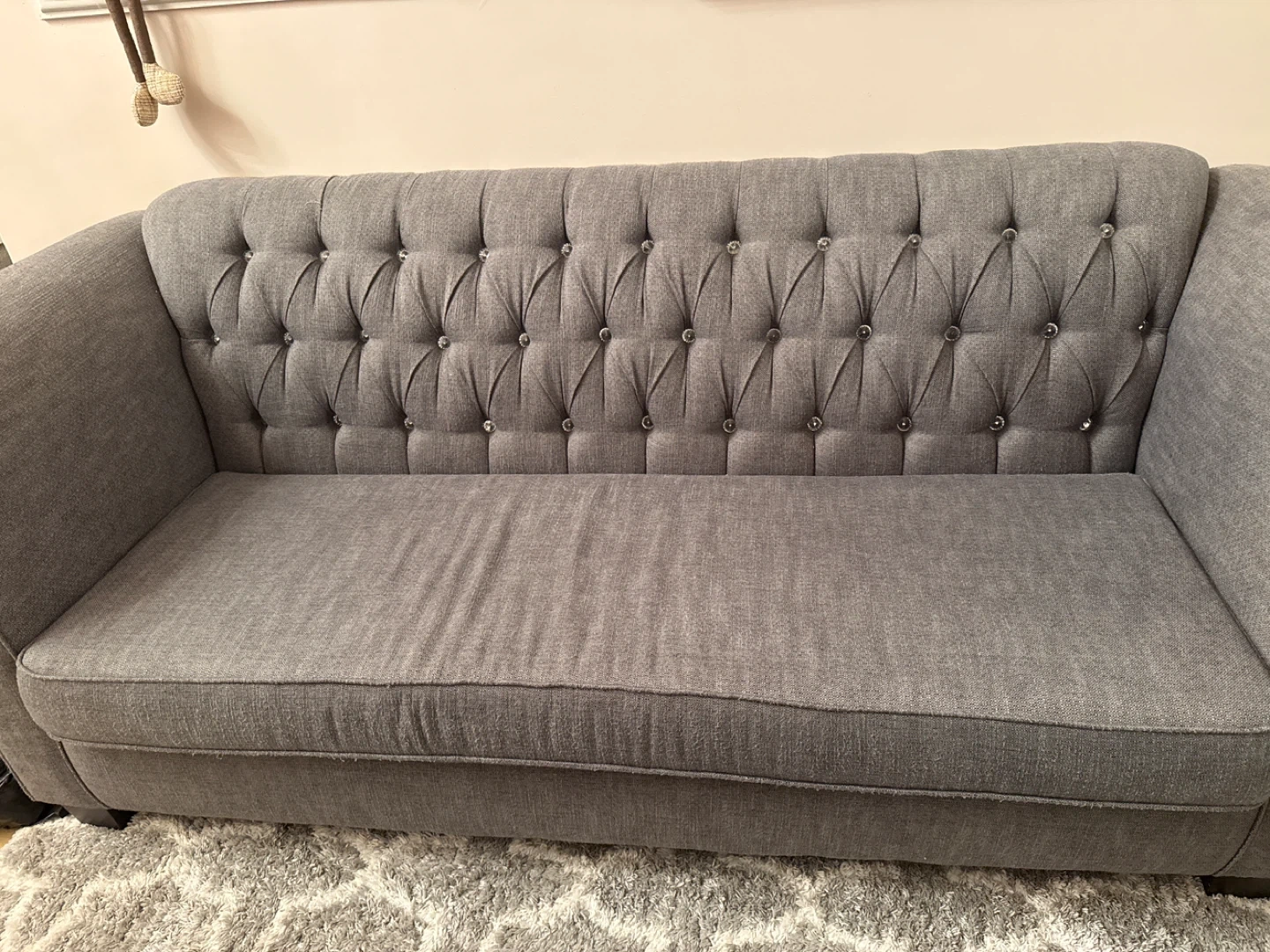 94Selling a lovely grey tufted sofa! It's in great condition and would look perfect in any living room. The tufted design gives it a classic, elegant look. If you're looking for a comfortable and stylish piece of furniture, this sofa is a great choice