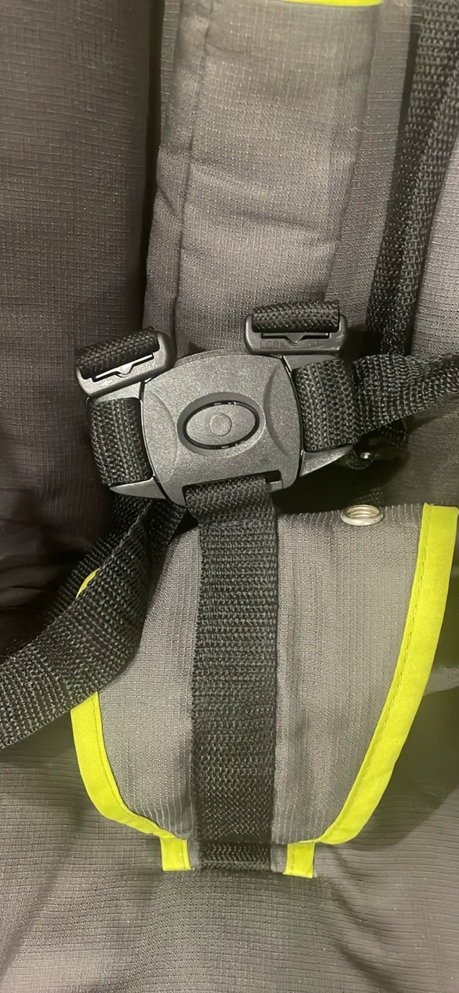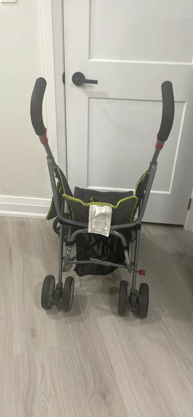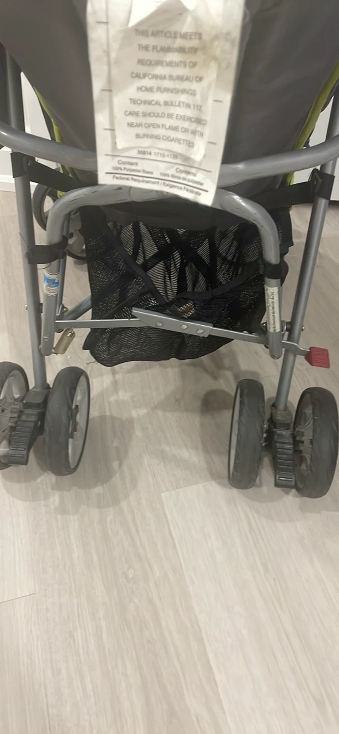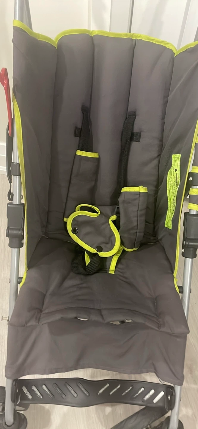 Selling a used umbrella stroller. It's grey with lime green accents. Perfect for quick trips and travel! It has a storage basket underneath and a five-point harness to keep your little one secure