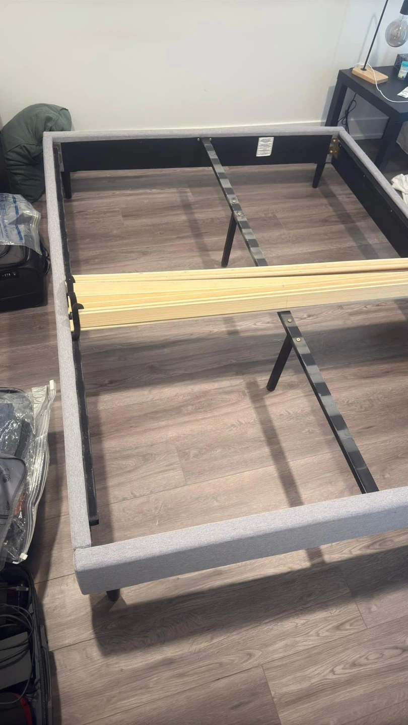 Selling a bed frame with a light grey upholstered finish. It's in great shape and ready for a new home! The frame includes the side rails, support beams, and legs, providing a sturdy base for your mattress. Please note that this is just the frame; the headboard is not included