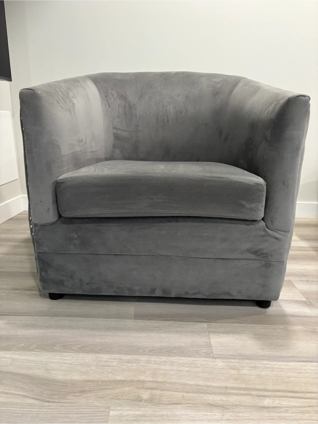 108Selling a lovely grey Lynn tufted accent chair. It's in excellent condition and would look great in any room! The velvet material is soft and the studded trim adds a touch of elegance Purchased at the Brick as a second living room set so was barely used Width: 32.5" (82.6 cm) Height: 37.75" (95.9 cm) Depth: 32" (81.3 cm) No Stains, No Damage No Smoking, No Pet Home Open to offers