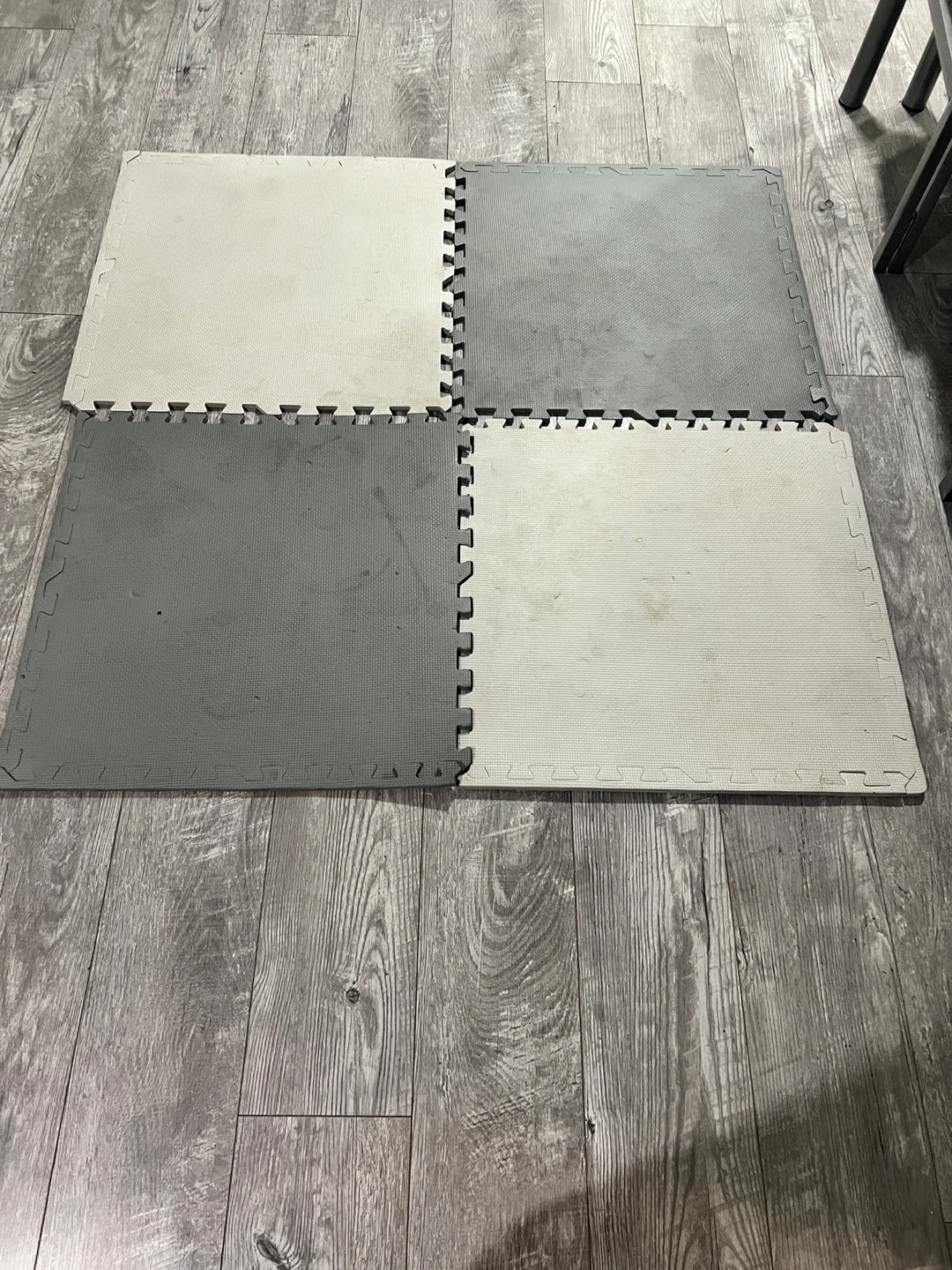 Selling four interlocking foam play mat tiles. They're in good condition and would be great for a kids' play area or a home gym. The colours are grey and white.