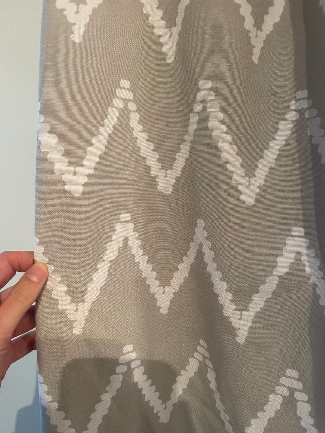 Selling a shower curtain with a grey and white zig-zag pattern, perfect for adding a touch of style to your bathroom. It's in great condition and ready to hang!