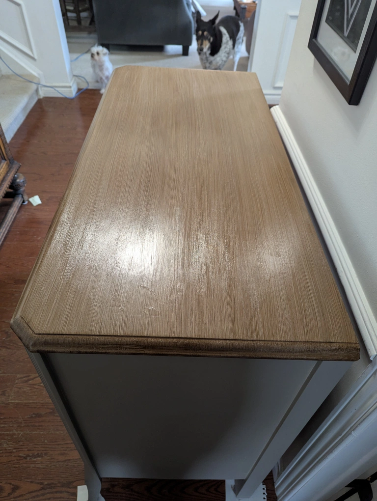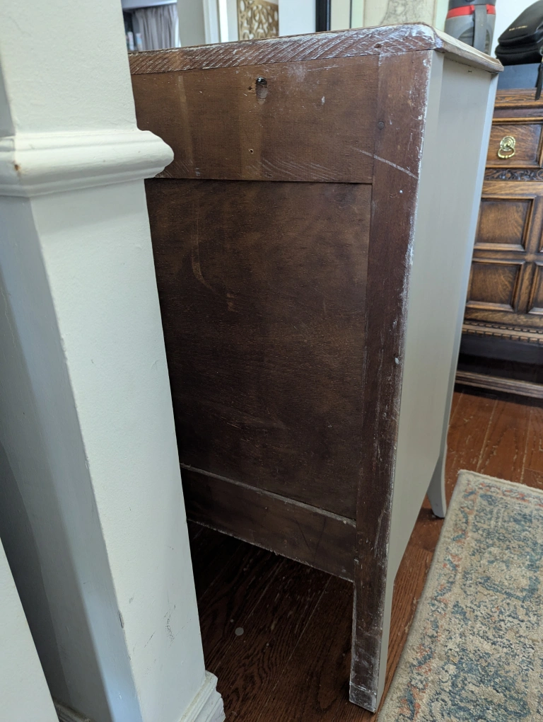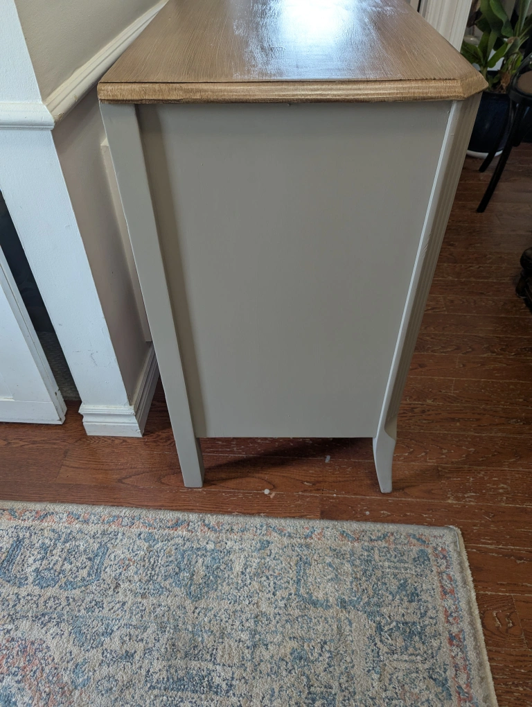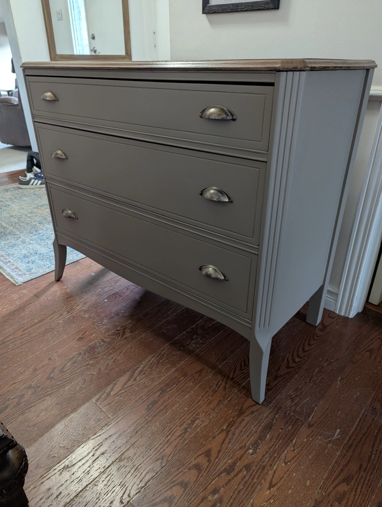 Selling a lovely wooden dresser with three drawers! It features a light wood top and a grey painted body. Solid wood I believe. The inside of the drawers have a decorative liner that is easily changeable. This dresser would be a great addition to any bedroom or living space. Open to offers, low-balls will not be entertained. pick up only in Forest Heights Kitchener.