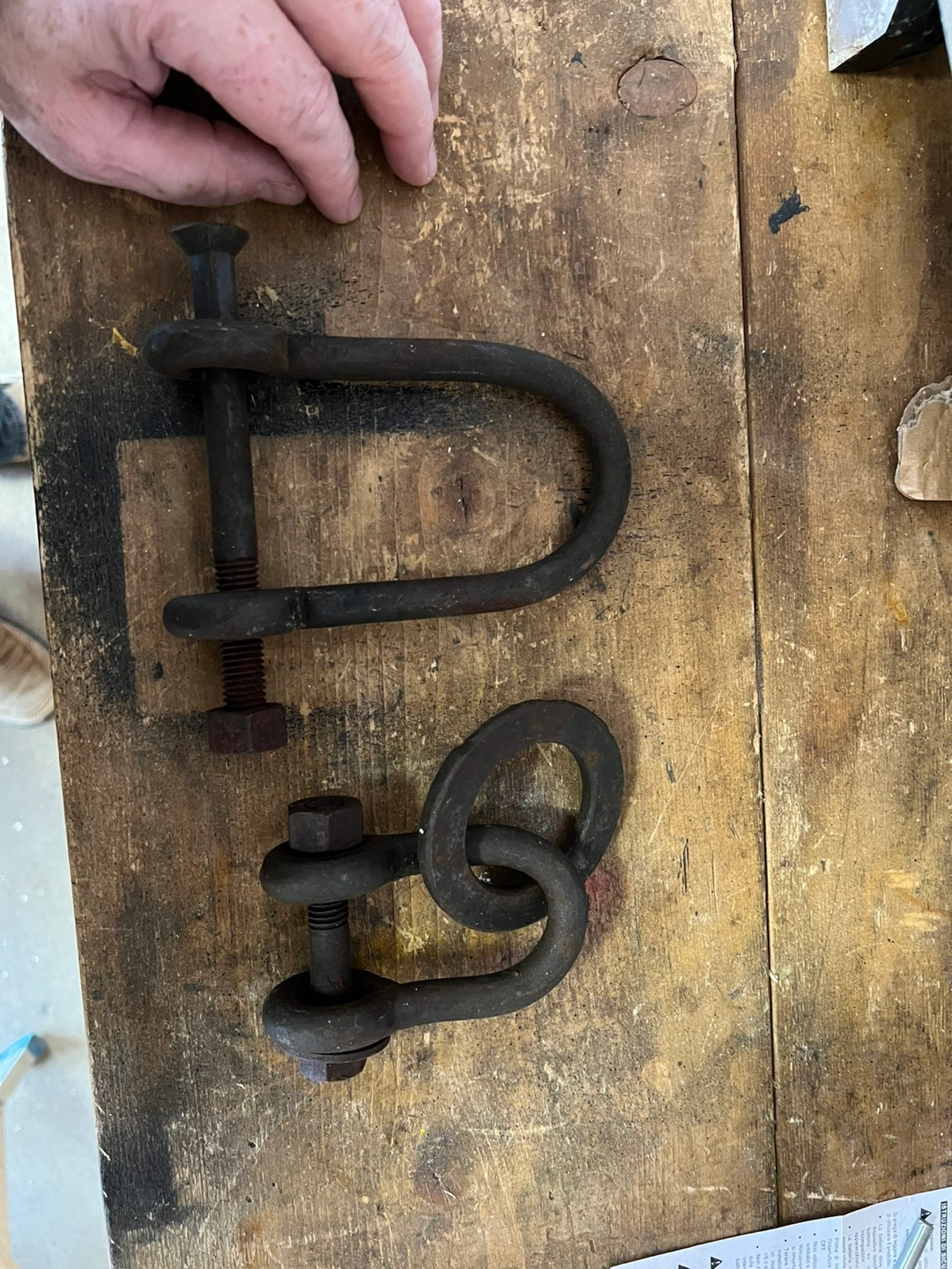 Two vintage metal shackles. Heavy-duty construction. Show signs of wear consistent with age and use. Great for rustic decor, industrial projects, or restoration.