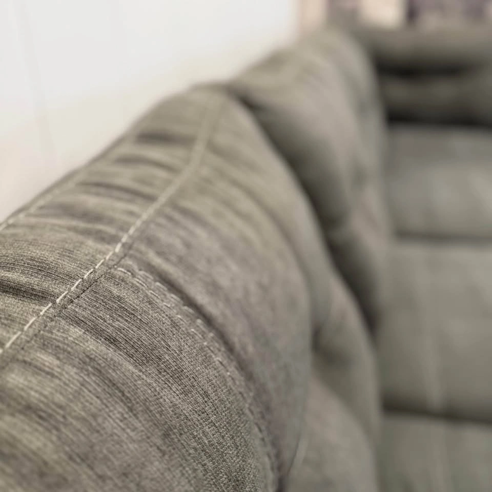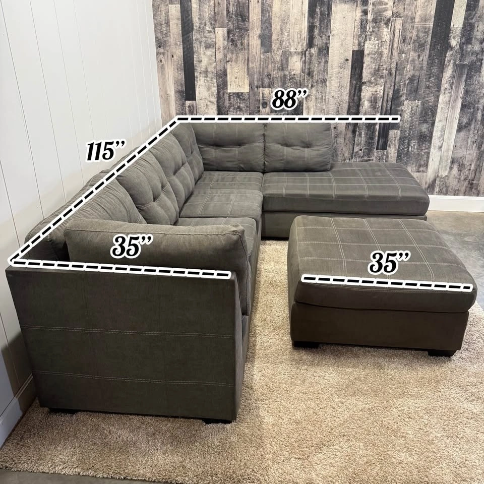 This Marleton model L-shaped sectional comes with a matching ottoman and features a fixed L configuration. The cushion covers are machine-washable, and the upholstery is a durable woven fabric. This sofa has been professionally steam cleaned with fabric shampoo and enzyme treatment. It comes from a non-smoking home and has no stains or rips. Dimensions are shown in the last photo.