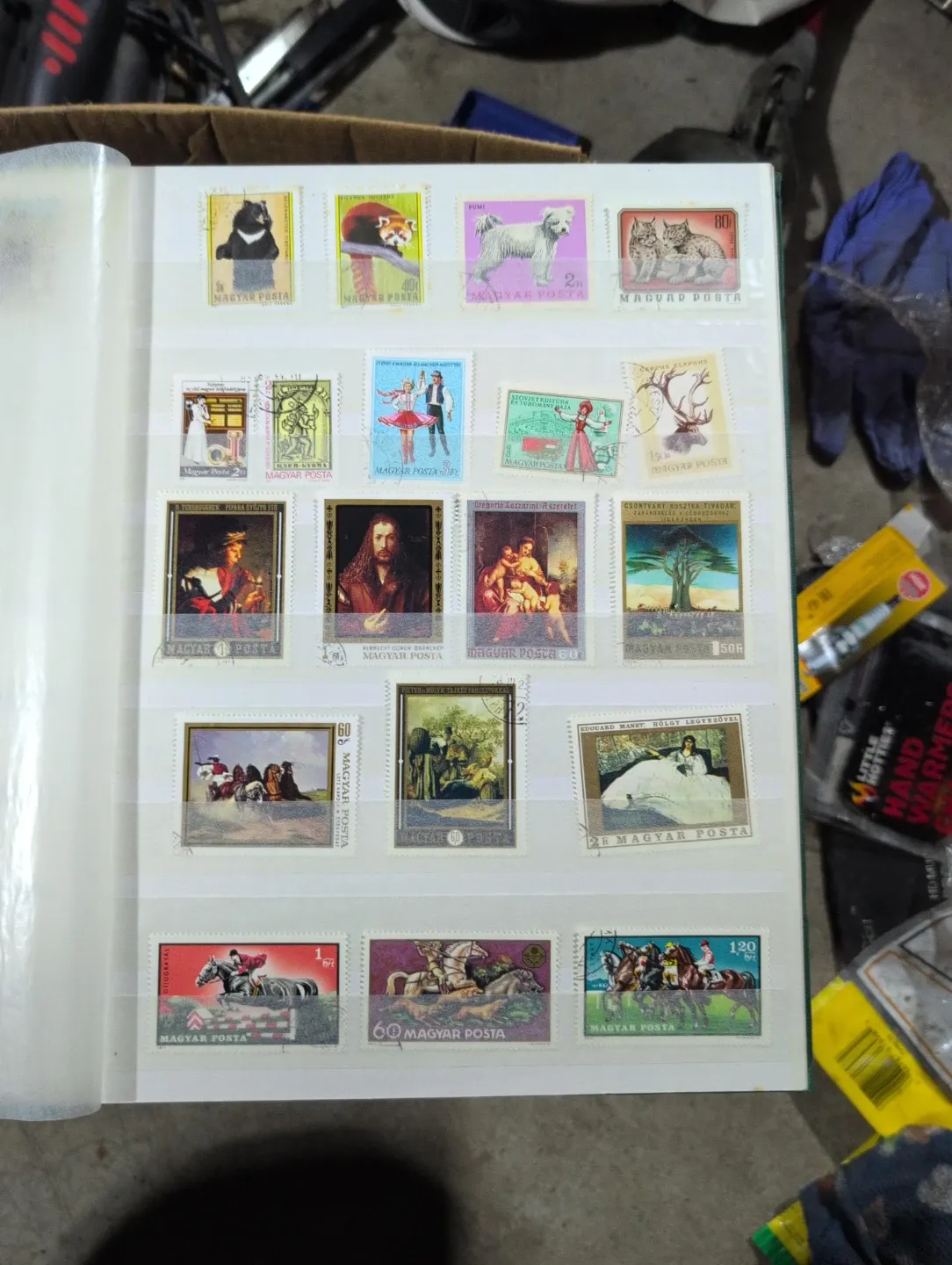 Collection of various postage stamps featuring diverse imagery from different countries. Includes depictions of animals, people, and art. Many stamps appear to be in good condition.