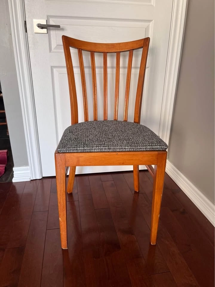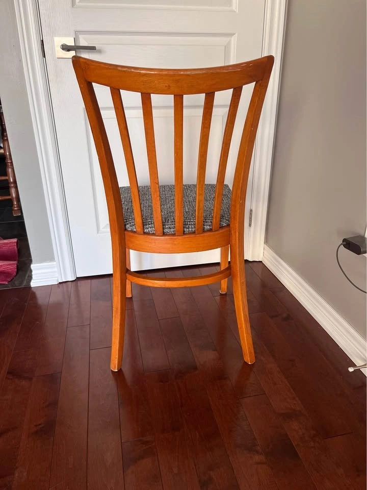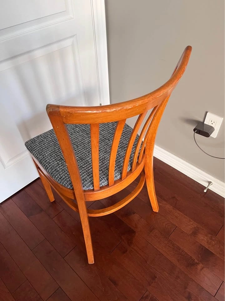 Four vintage bentwood style dining chairs, newly upholstered in a gray textured fabric. All chairs are sturdy with age-appropriate wear.