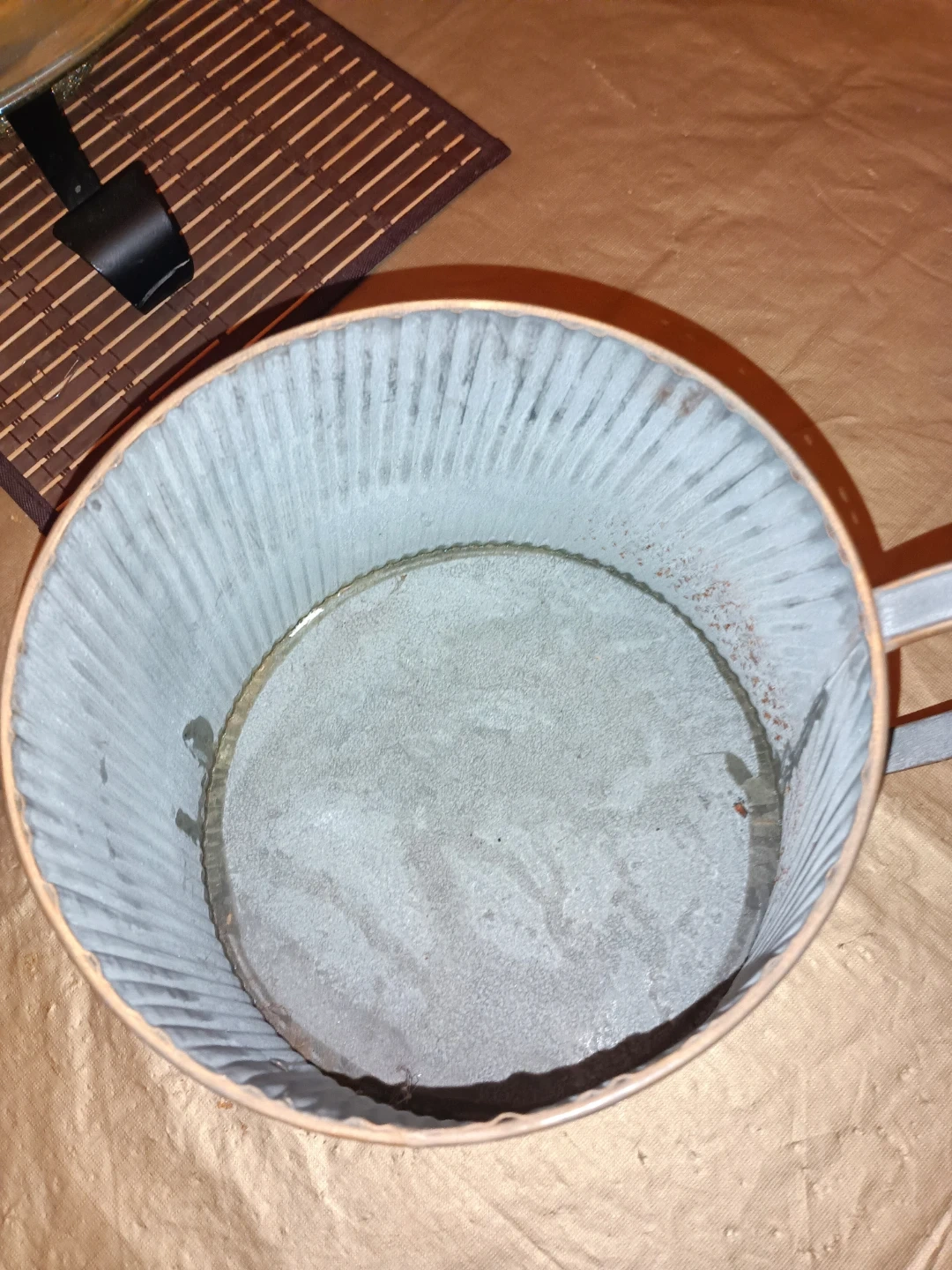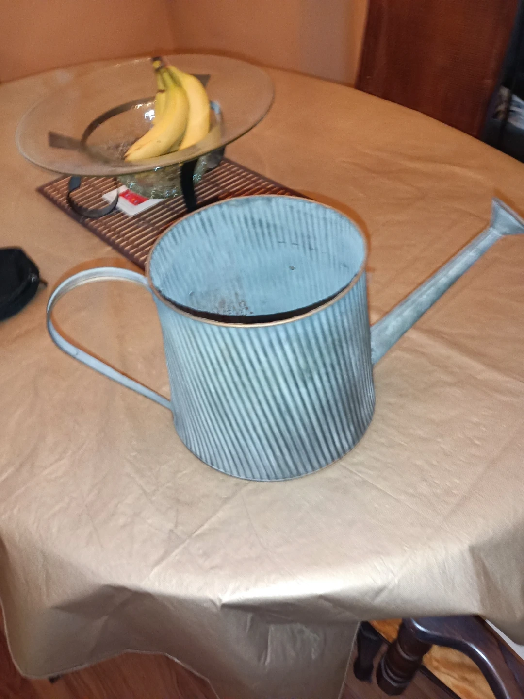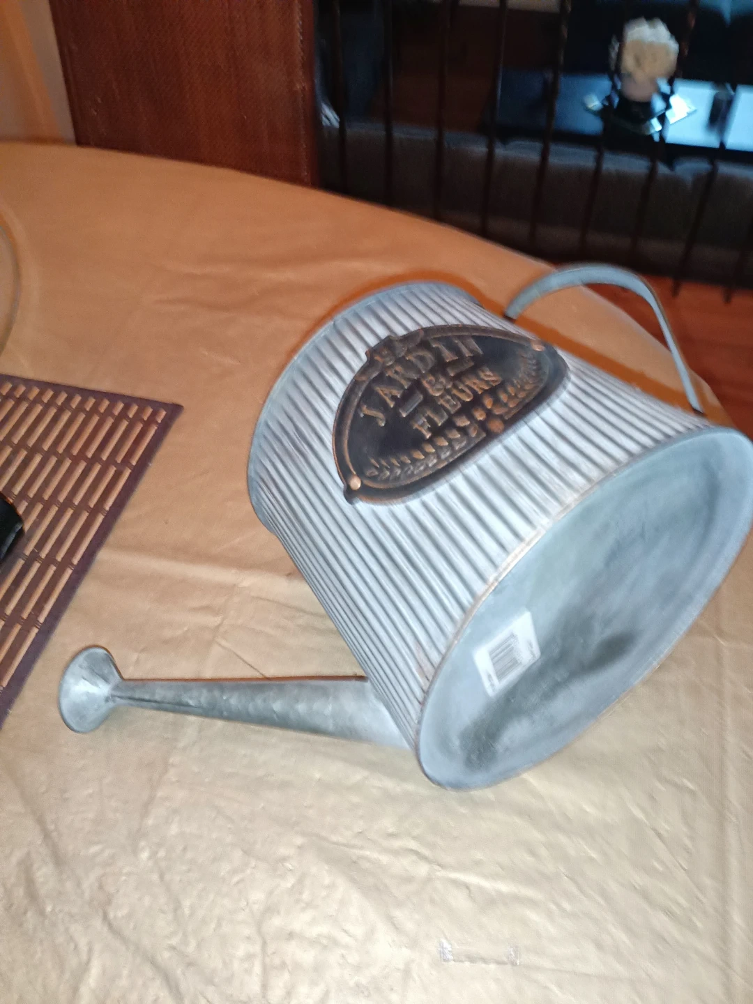 Galvanized metal watering can with a decorative 'Jardin & Fleurs' emblem. Features a spout and handle for easy use. Suitable for watering plants indoors or outdoors.No holes.