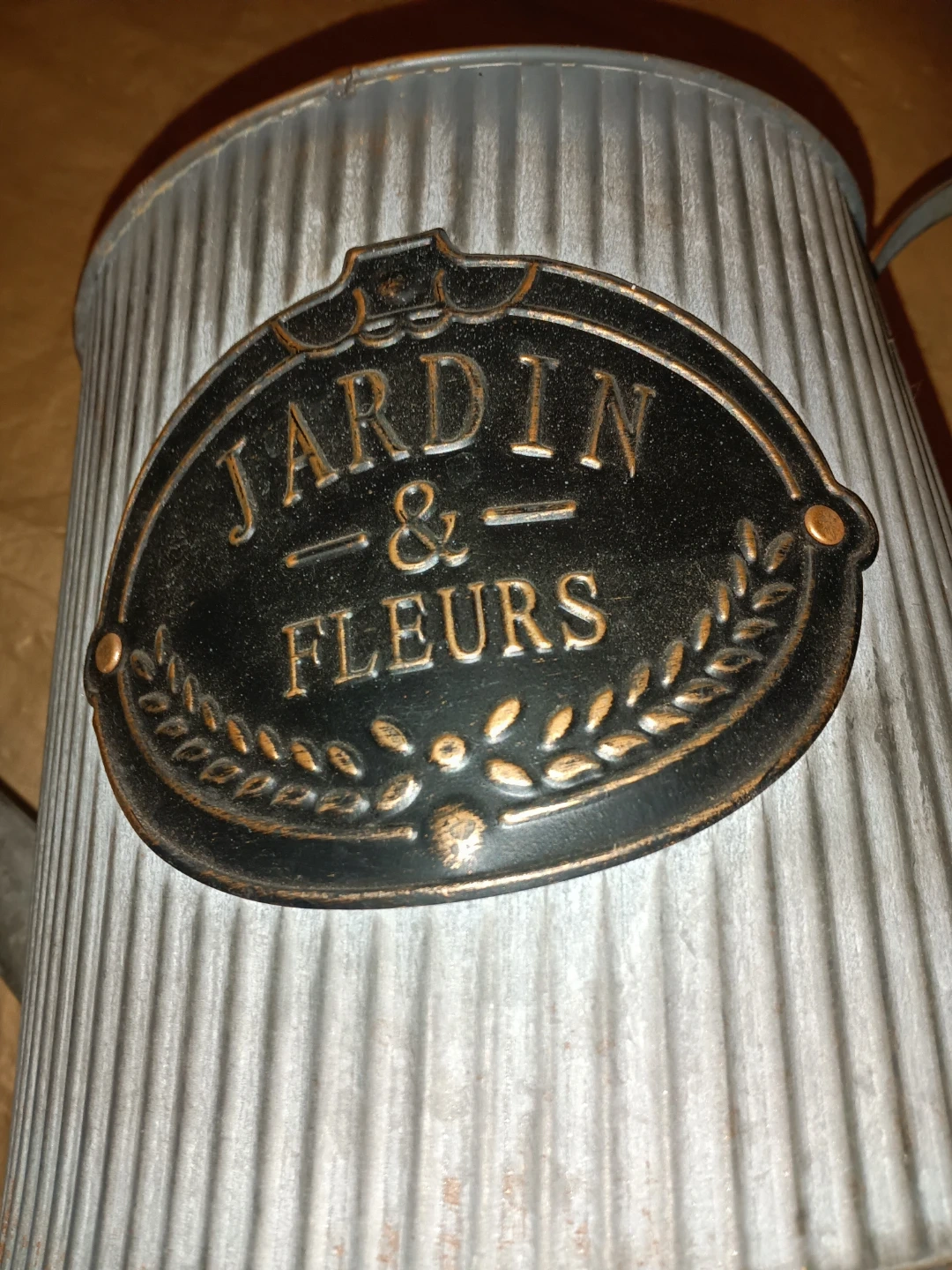 Galvanized metal watering can with a decorative 'Jardin & Fleurs' emblem. Features a spout and handle for easy use. Suitable for watering plants indoors or outdoors.No holes.
