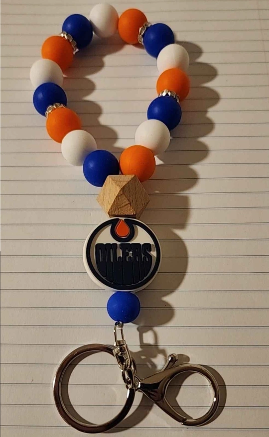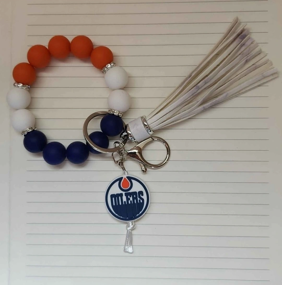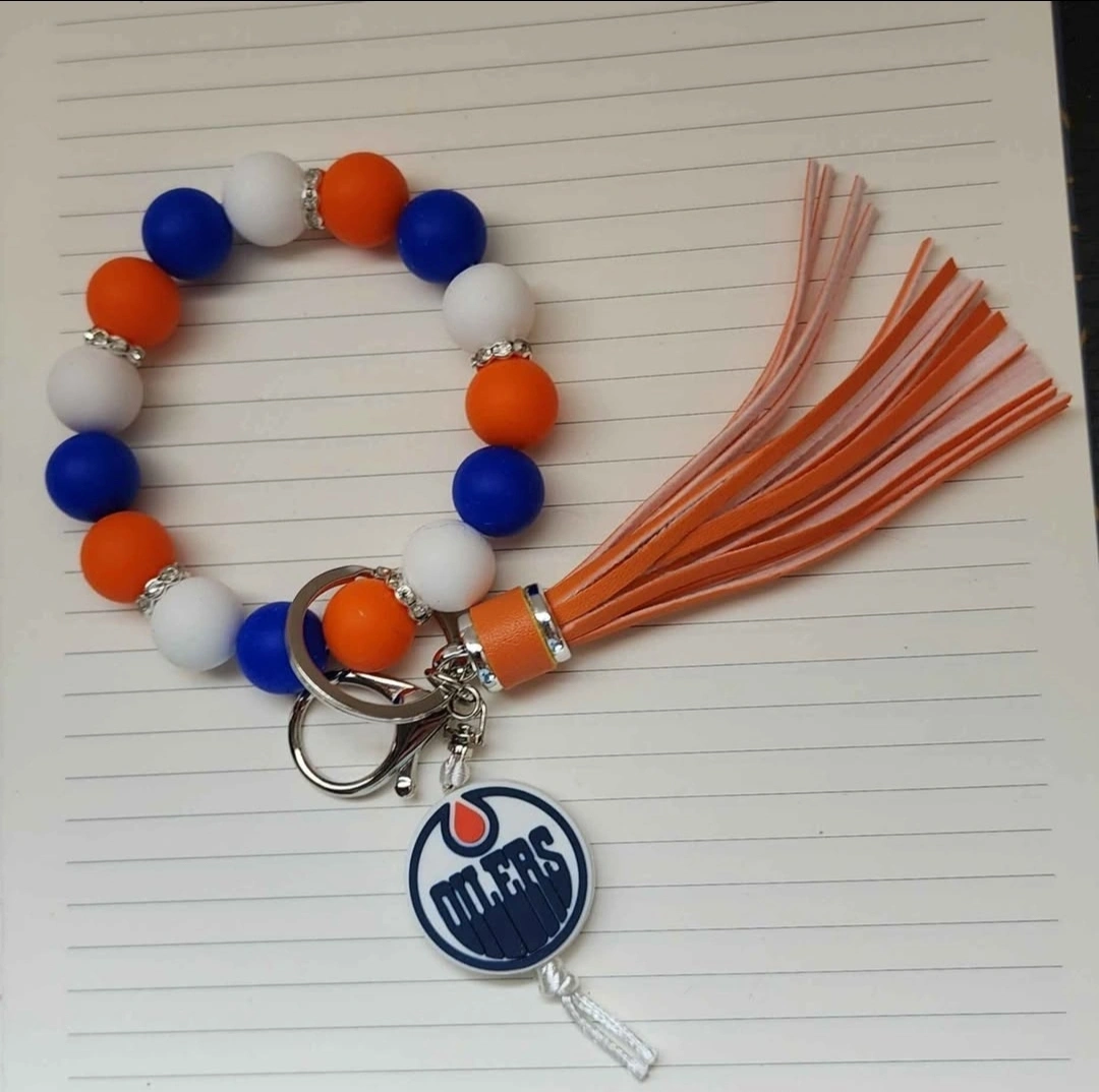 Show off your Oilers pride with these beaded keychain bracelets! They feature the team logo and come in a variety of colours, including orange, blue, and white. Perfect for keeping your keys handy while repping your favourite team