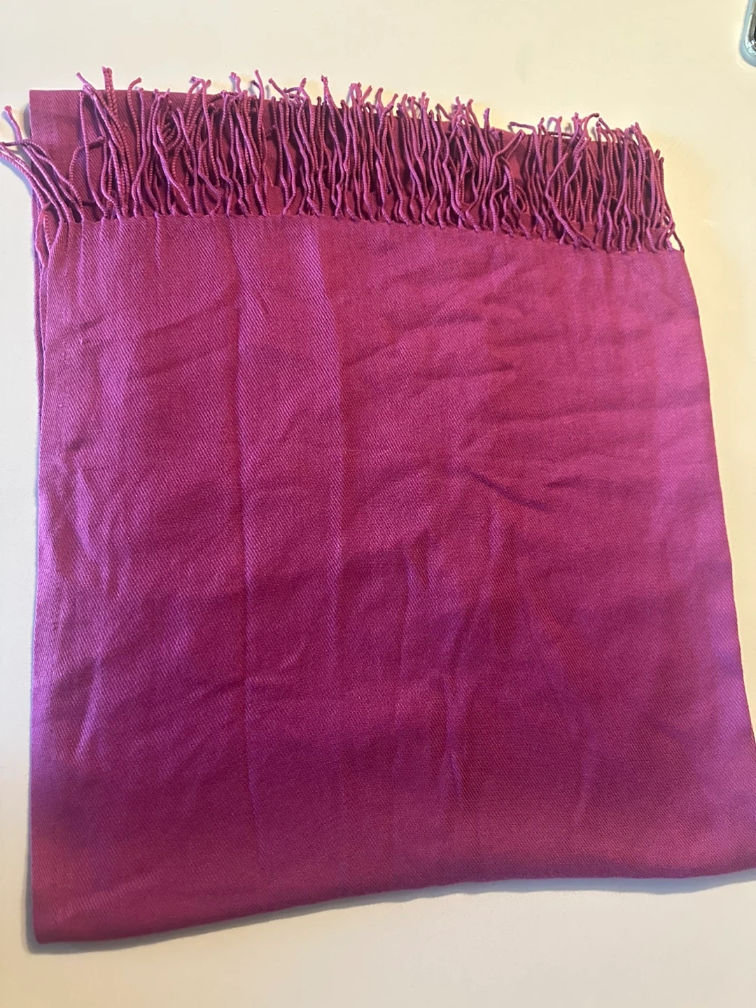 A beautiful scarf in vibrant magenta and red hues. It's a lovely accessory for adding a pop of colour to any outfit. The fringed edges give it a stylish finish. This versatile scarf is perfect for cooler and warm weather!