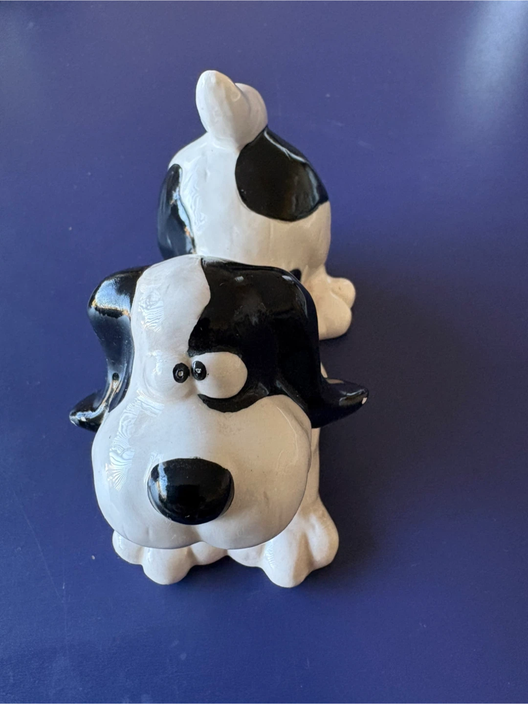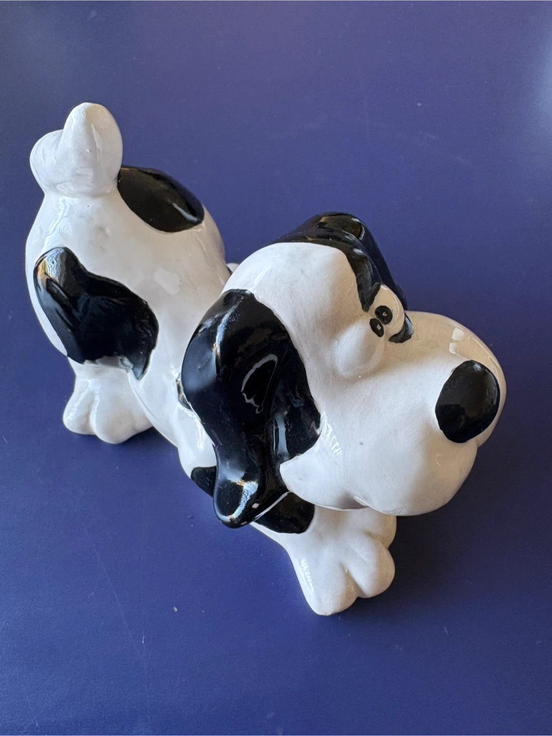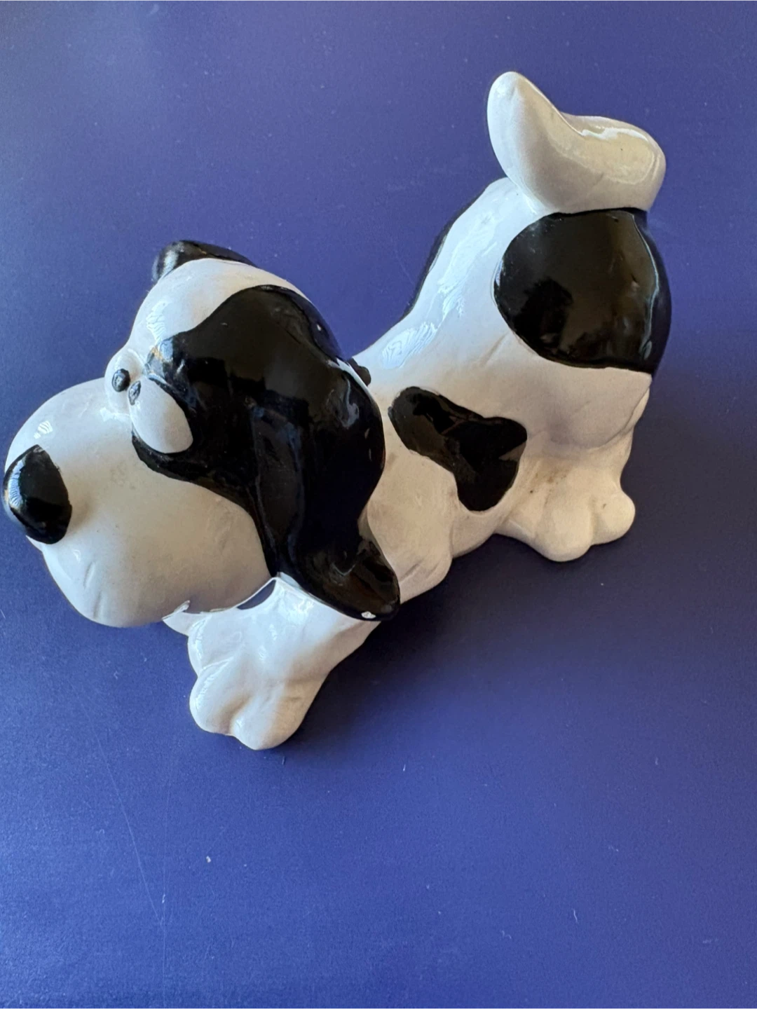 Cute ceramic dog figurine with a black and white spotted pattern, featuring a glossy finish and a playful design. It's a charming decorative piece for any home. Would look great on a shelf or desk!