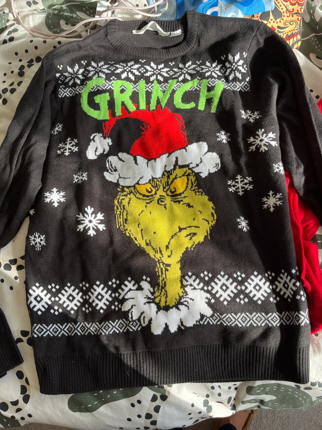 45Get ready for the holidays with this fun Grinch-themed Christmas sweater! It's black with a festive Grinch design and snowflake details. Kids size 14+ or fits women’s xs. Get into the season:)