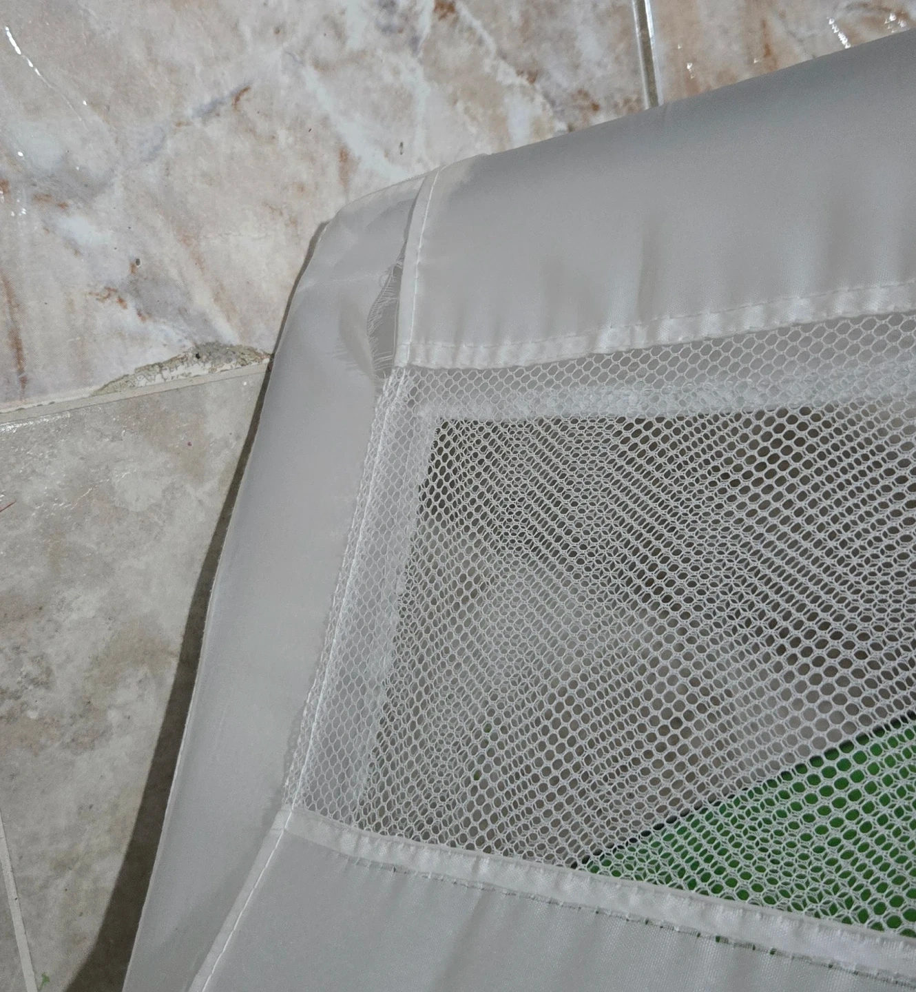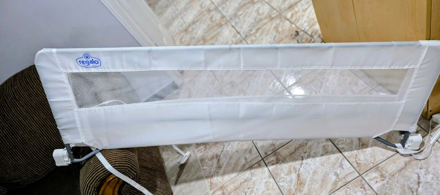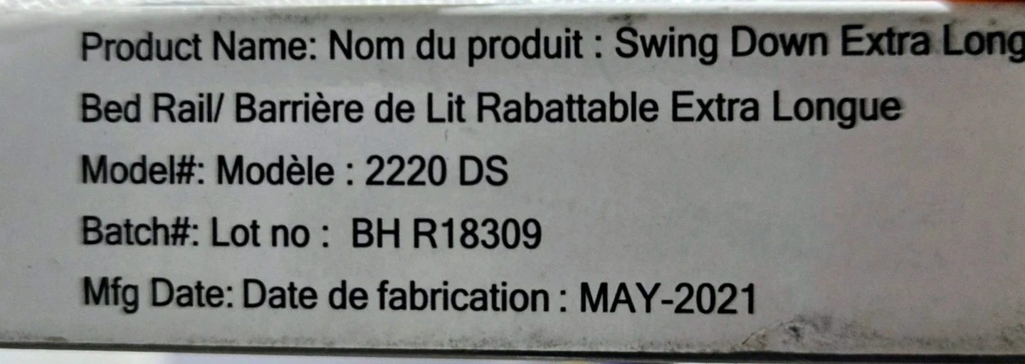 Regalo Swing Down Extra Long Bed Rail, model 2220 DS. Manufactured in May 2021. This bed rail helps prevent kids from falling out of bed. It's made with a durable mesh fabric and a metal frame.