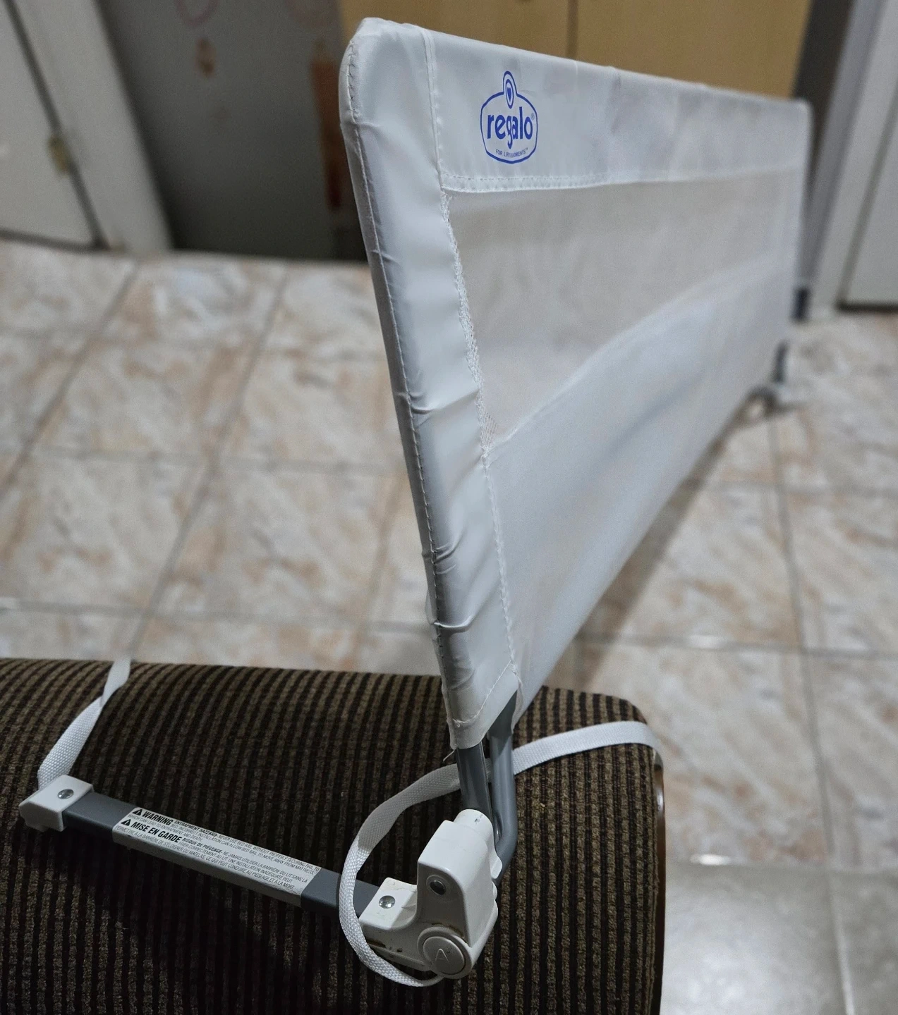 Regalo Swing Down Extra Long Bed Rail, model 2220 DS. Manufactured in May 2021. This bed rail helps prevent kids from falling out of bed. It's made with a durable mesh fabric and a metal frame.