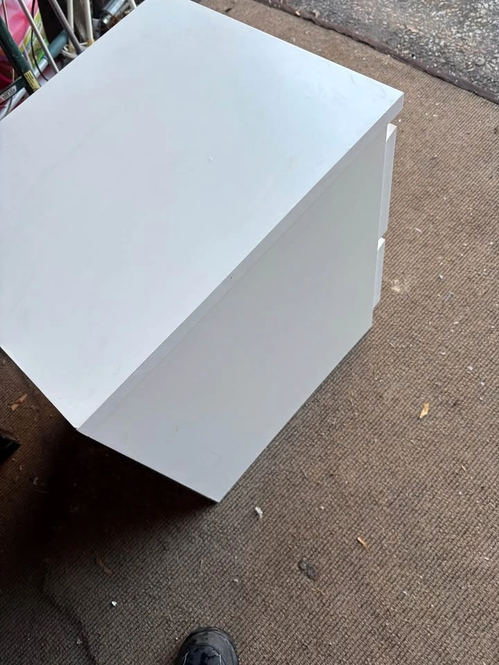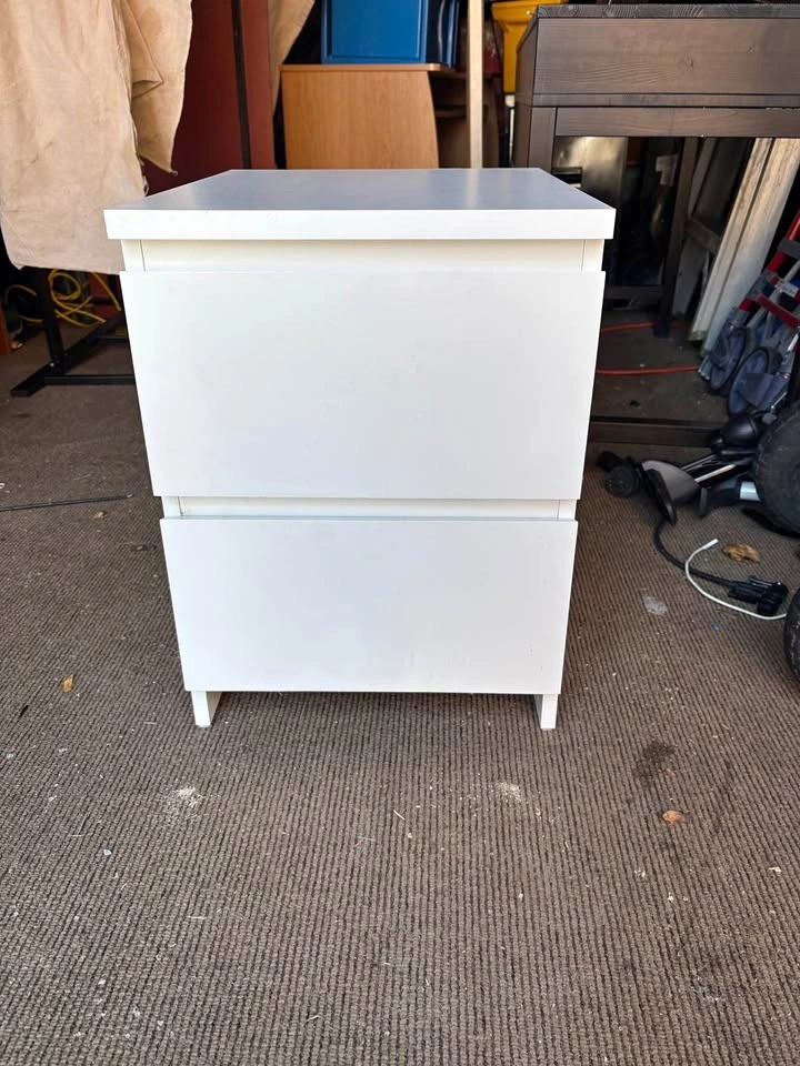 Has two spacious drawers for storage. Good for a nightstand or extra storage. Clean white finish. Both drawers open and close smoothly. Dimensions: 19" W x 16" D x 22" H. Located near Yonge and Davisville.