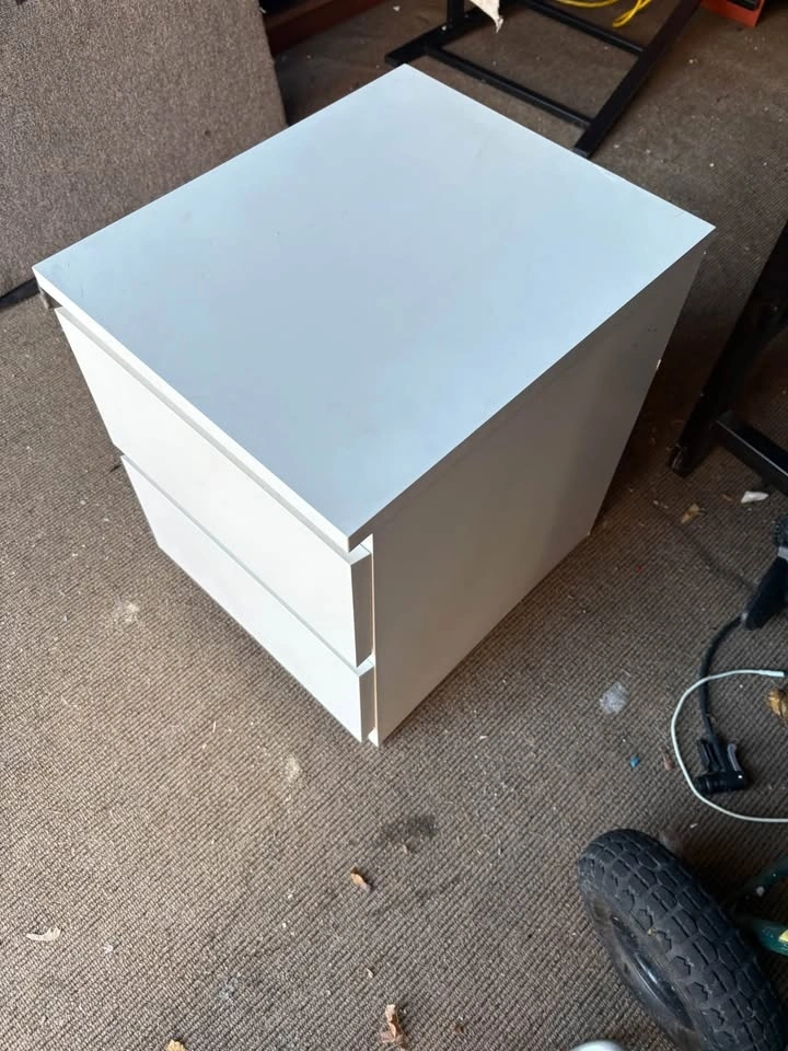 Has two spacious drawers for storage. Good for a nightstand or extra storage. Clean white finish. Both drawers open and close smoothly. Dimensions: 19" W x 16" D x 22" H. Located near Yonge and Davisville.