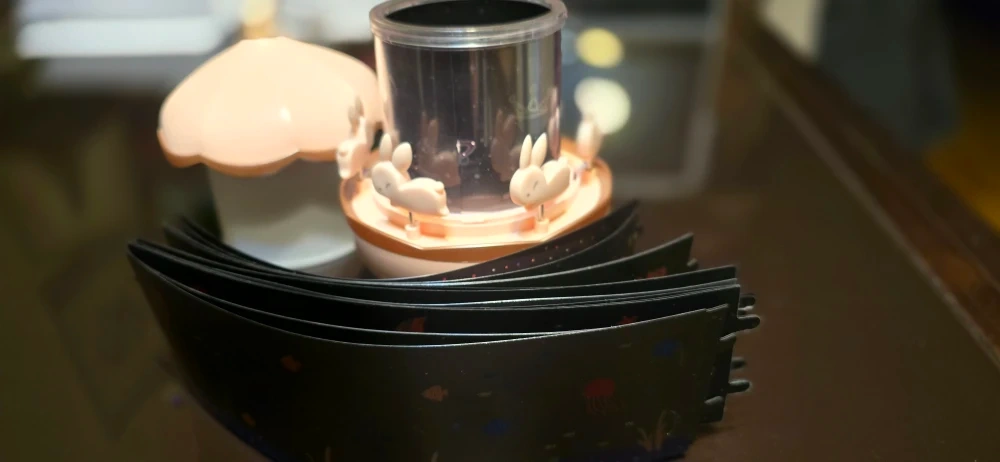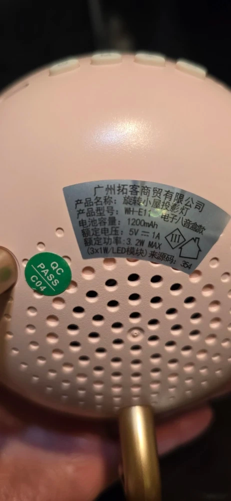 This pink projector night light creates a starry sky effect for kids' rooms. It features rotating bunnies and comes with multiple projection films for different patterns. Operates on 5V/1A with a 1200mAh battery capacity.