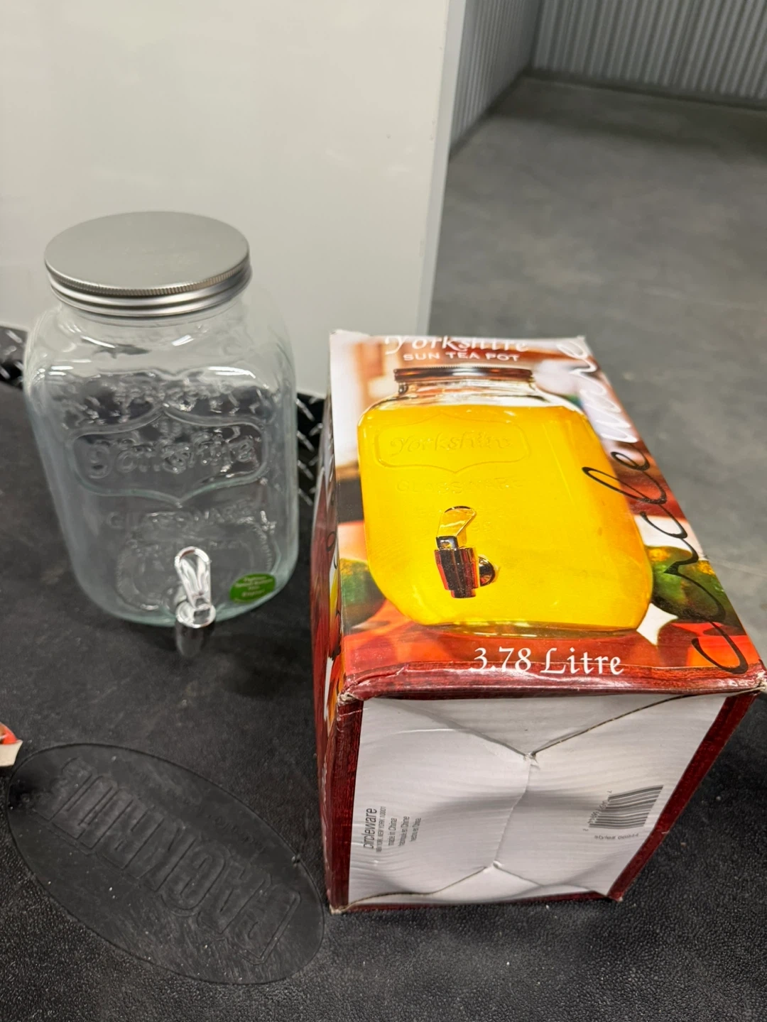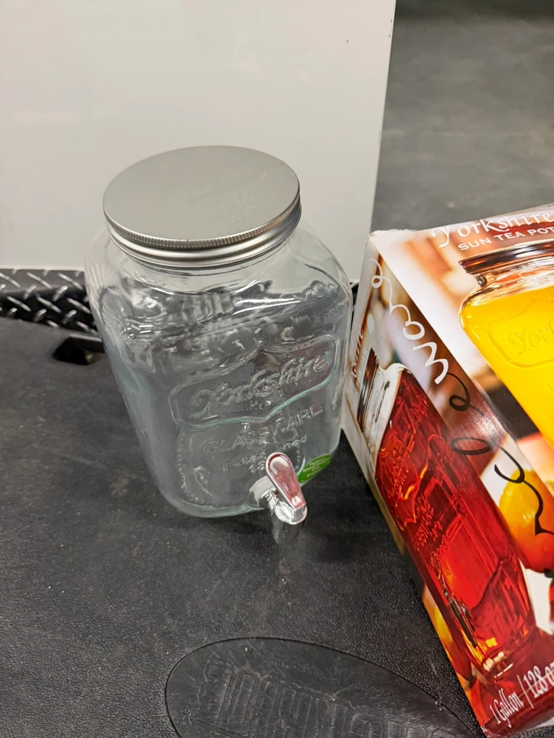 Yorkshire Sun Tea Pot beverage dispenser. It's a glass dispenser with a metal lid and spigot. Holds 3.78 Litres. Great for serving drinks at parties or gatherings!