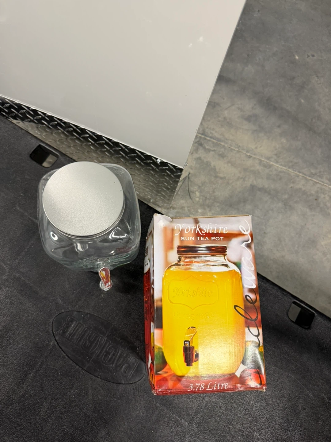 Yorkshire Sun Tea Pot beverage dispenser. It's a glass dispenser with a metal lid and spigot. Holds 3.78 Litres. Great for serving drinks at parties or gatherings!