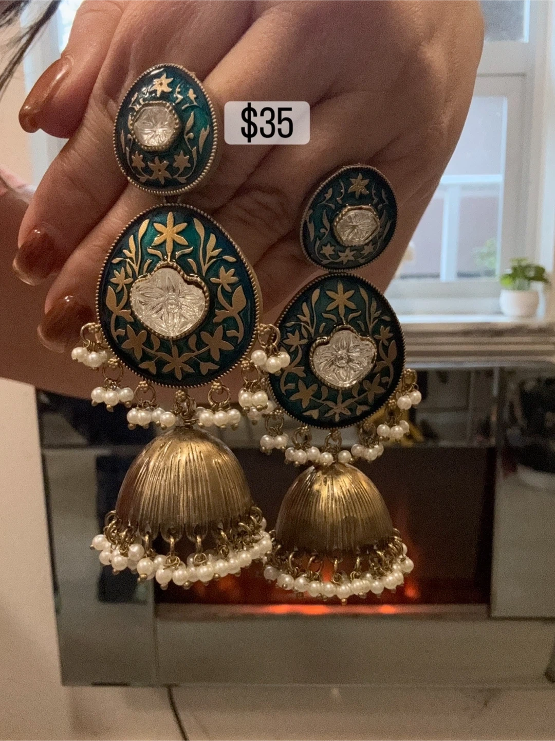 Beautiful teal and gold jhumka earrings with pearl accents! These earrings are in great condition and ready to add a touch of elegance to any outfit. Asking $35