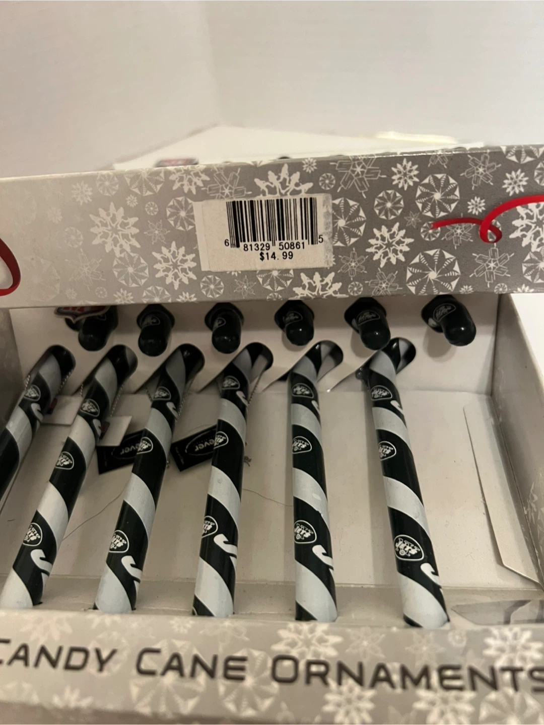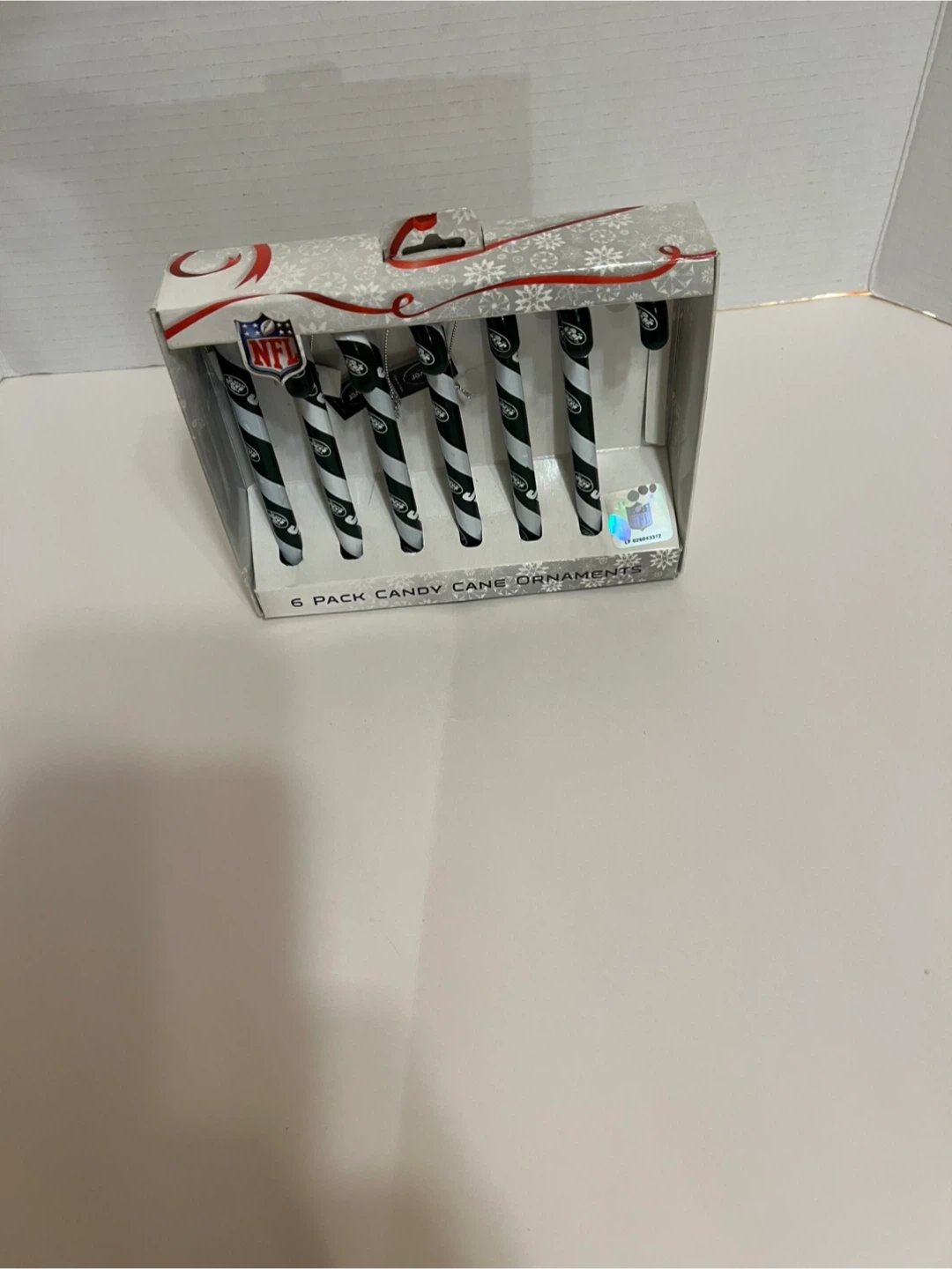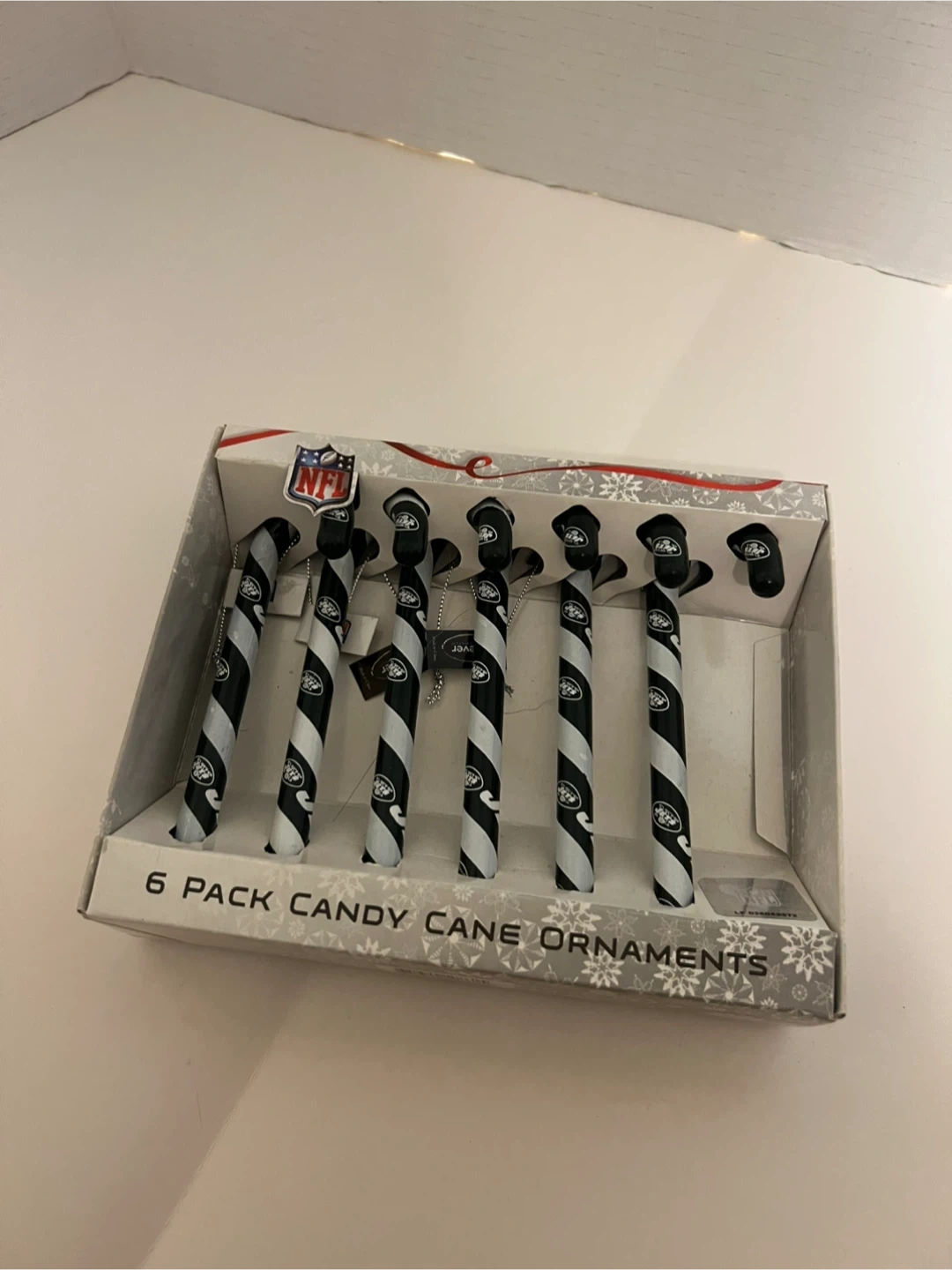 This is a 6-pack of NFL New York Jets candy cane Christmas ornaments.