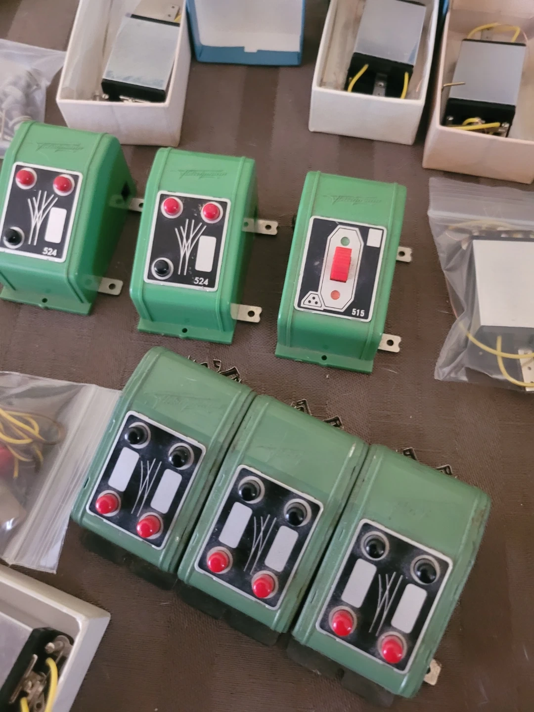 This lot includes various Atlas Selector and Controller switches, a Trix Express transformer, and numerous sections of model train track, including turnouts and a crossing. Several accessory pieces are also included, such as momentary toggle switches and components in original boxes. It's a great collection for any model railway enthusiast!