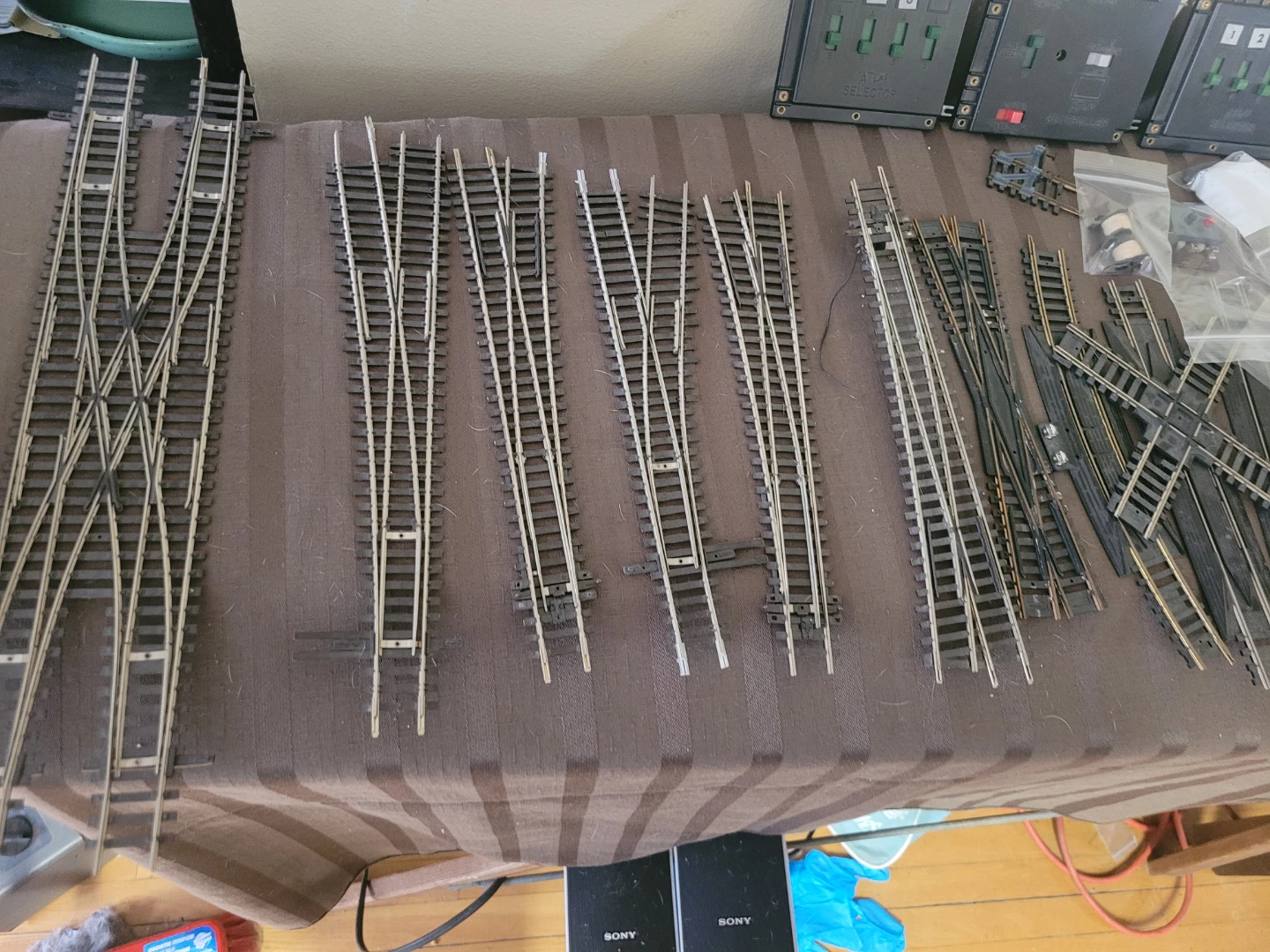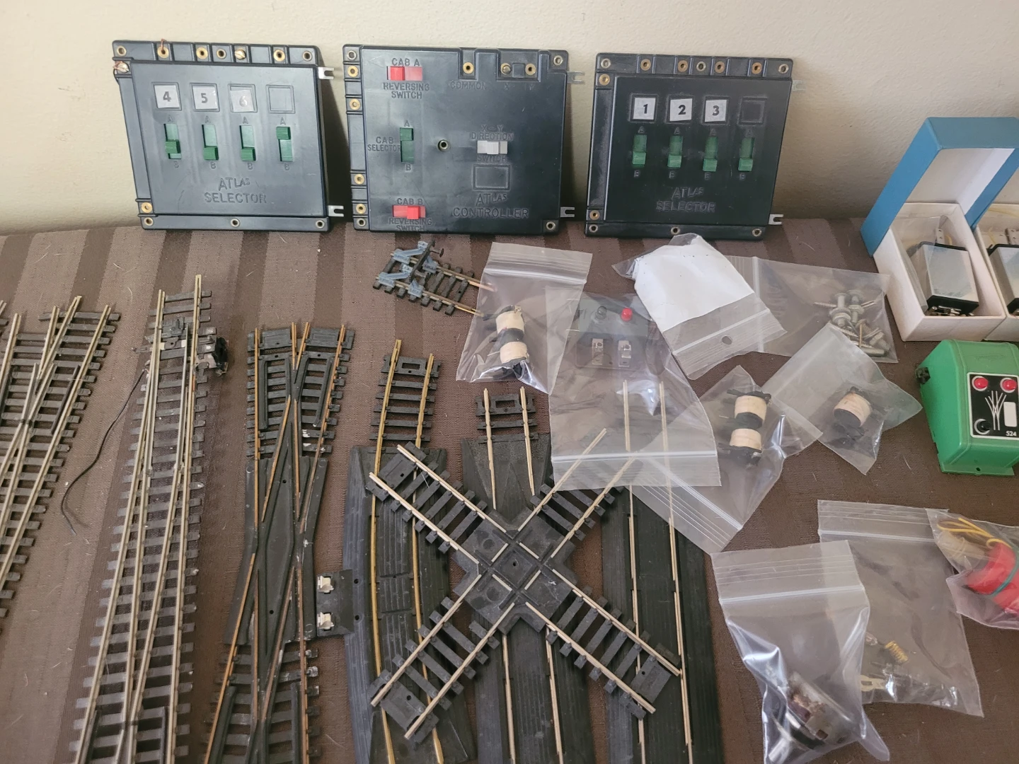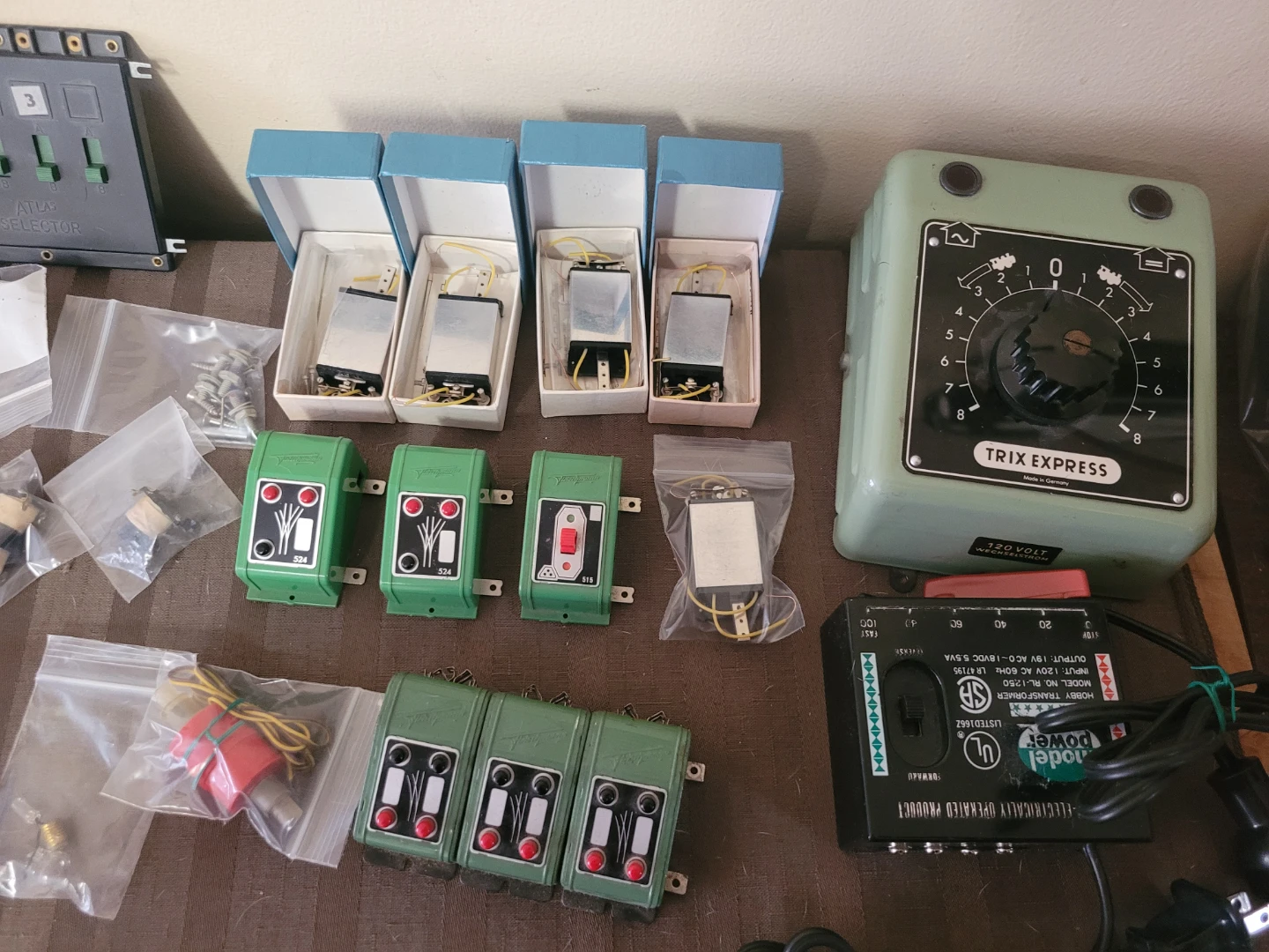 This lot includes various Atlas Selector and Controller switches, a Trix Express transformer, and numerous sections of model train track, including turnouts and a crossing. Several accessory pieces are also included, such as momentary toggle switches and components in original boxes. It's a great collection for any model railway enthusiast!
