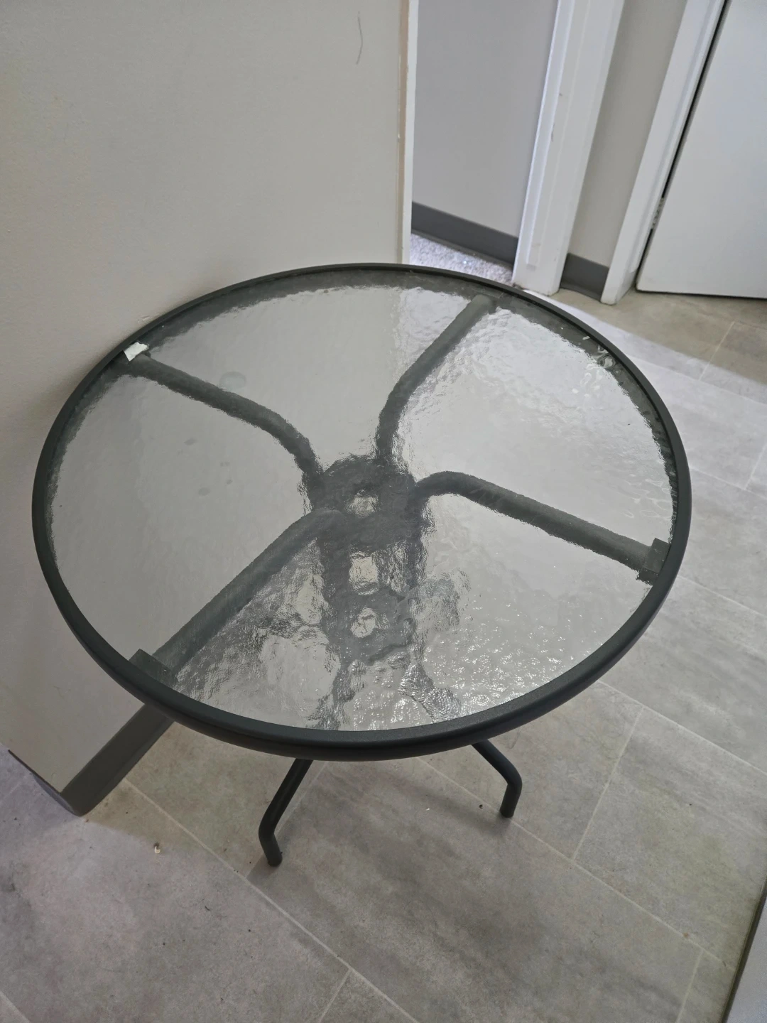 Round patio table with a textured glass top and metal base. This table is suitable for outdoor use. It's perfect for enjoying a morning coffee or a small outdoor gathering.