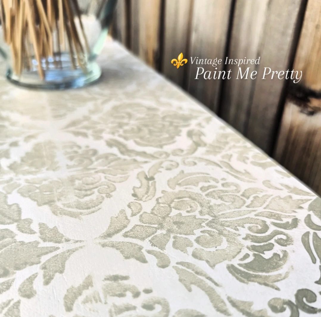This one-of-a-kind piece has been lovingly redesigned and hand-painted in Behr’s Miniature Rose chalk paint. A delicate stencil design embellished flowers, soft distressing, and a protective Varathane finish give it timeless beauty while keeping it sturdy and practical.