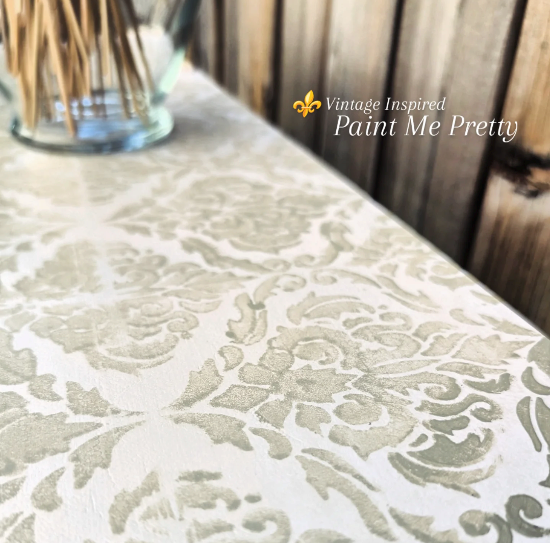 This one-of-a-kind piece has been lovingly redesigned and hand-painted in Behr’s Miniature Rose chalk paint. A delicate stencil design embellished flowers, soft distressing, and a protective Varathane finish give it timeless beauty while keeping it sturdy and practical.