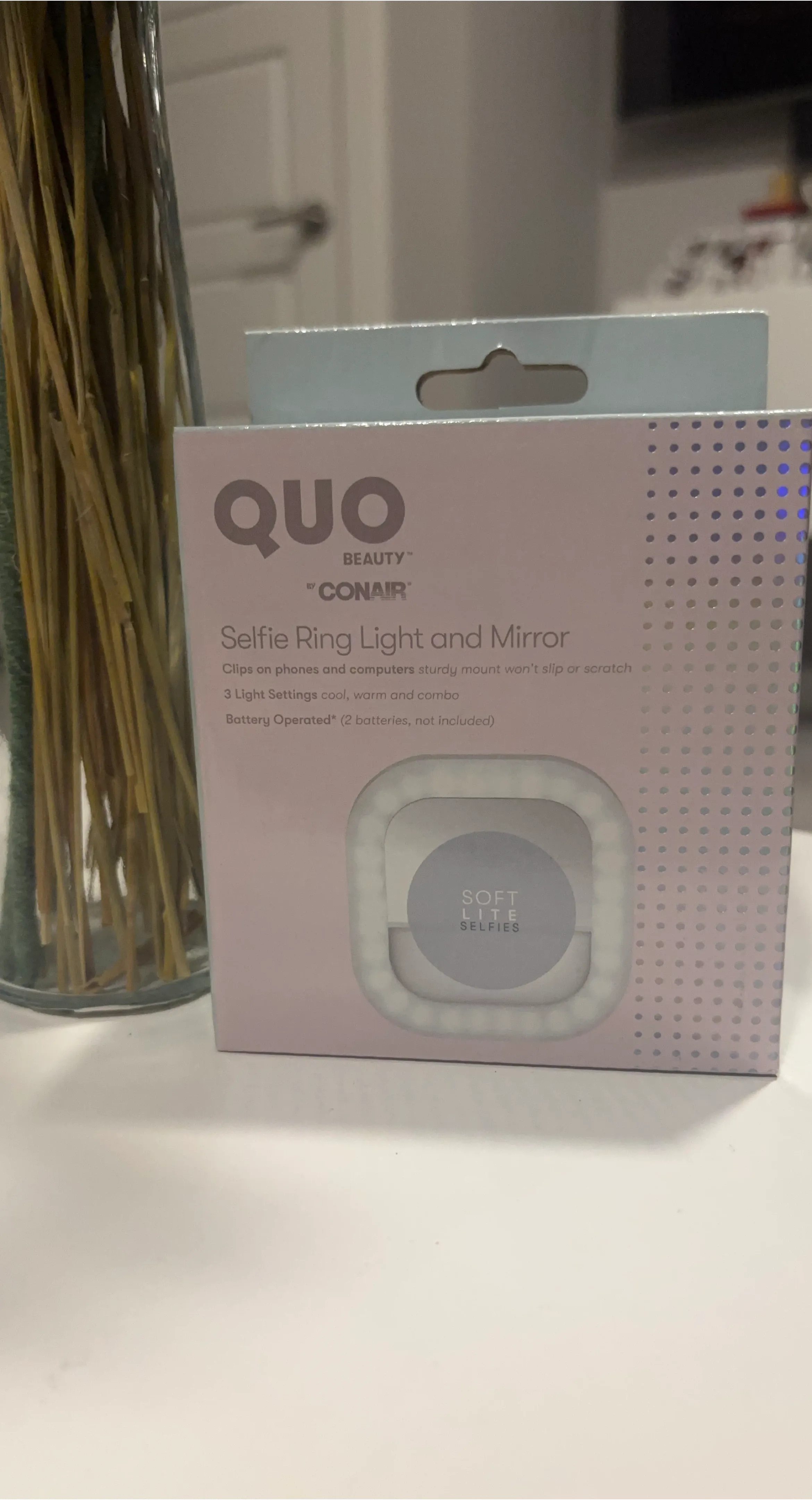 This QUO by Conair selfie ring light and mirror clips onto phones and computers. It has 3 light settings: cool, warm, and combo. It's battery operated and requires 2 batteries, which are not included.