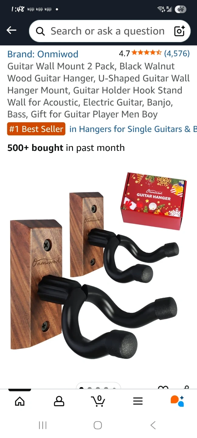 This is a 2-pack of Onmiwod guitar wall mounts. They're made from black walnut wood with a U-shaped, not-slip yoke that pivots to fit any headstock. Includes mounting hardware.