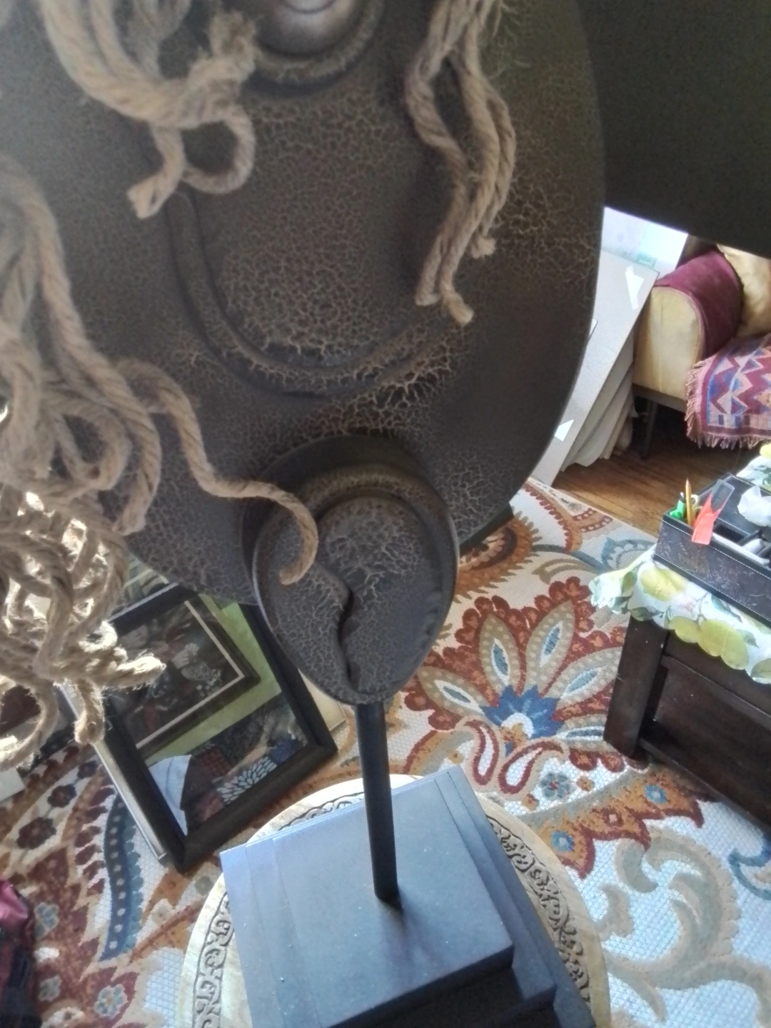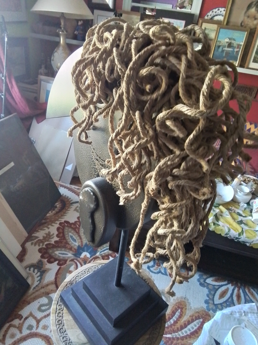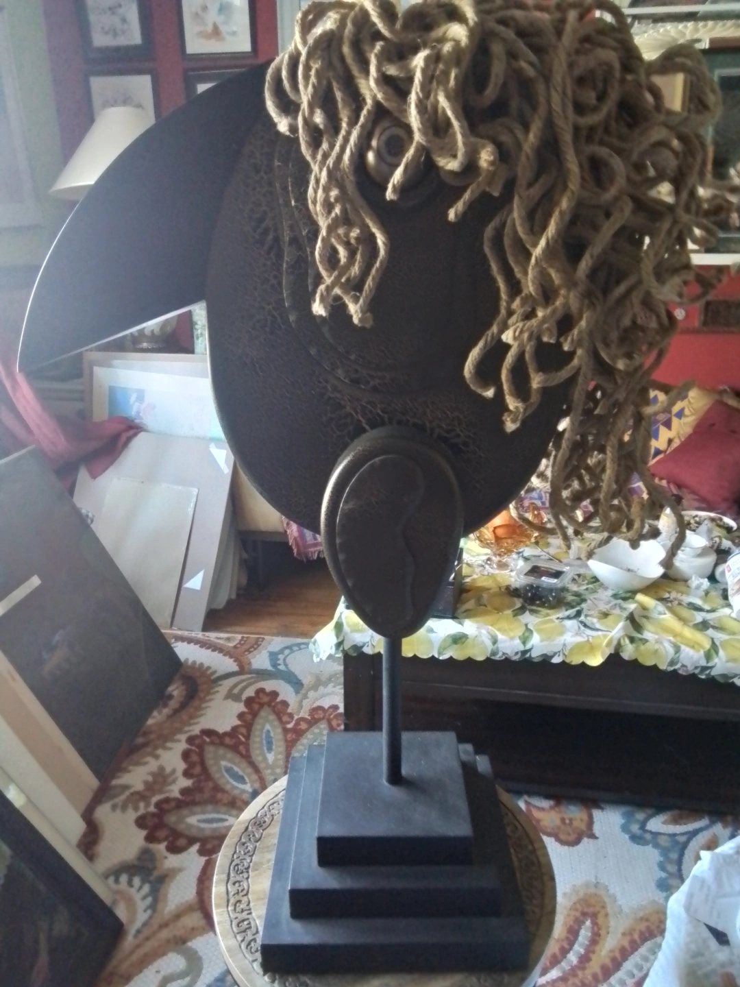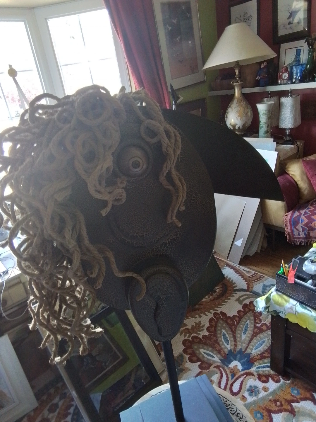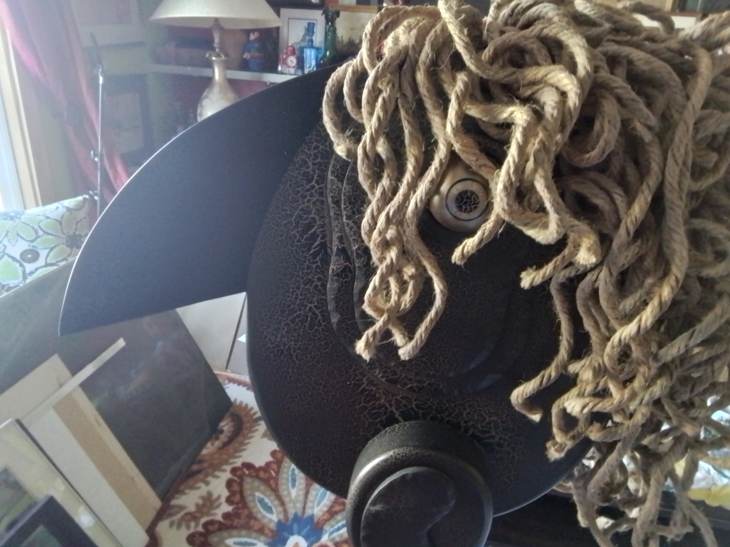 114Grotesque Goony Bird Stephen Winer Studio Wood Rope Large Sculpture 33" Tall Check out this unique piece of art! This is a grotesque "Goony Bird" sculpture by Stephen Winer Studio, 2010. The sculpture is made of wood and rope and stands approximately 33" tall. This item is in used condition as shown in the pictures, adding to its character and charm. Sound clean intact Measurements: 33" x 18" Unique dark-coloured metal sculpture. Features rope-like hair and stands on a black base. Signed and dated 2010. Pickup at Young Street and Steels Ave