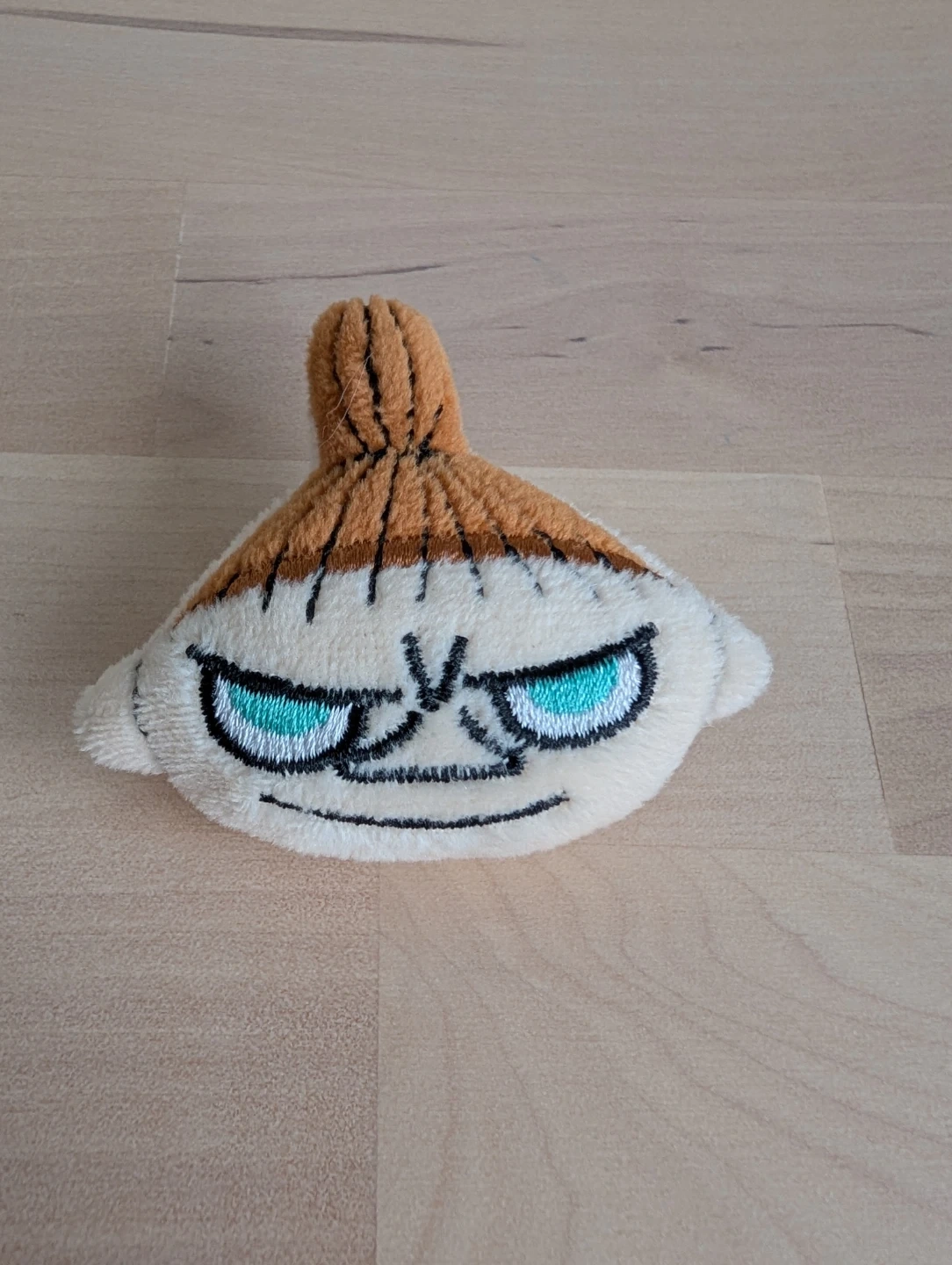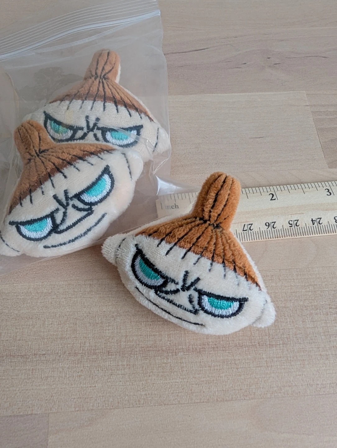 This is a plush badge featuring a Moomin character. It has a metal pin back for attachment. Measures about 2 inches tall.