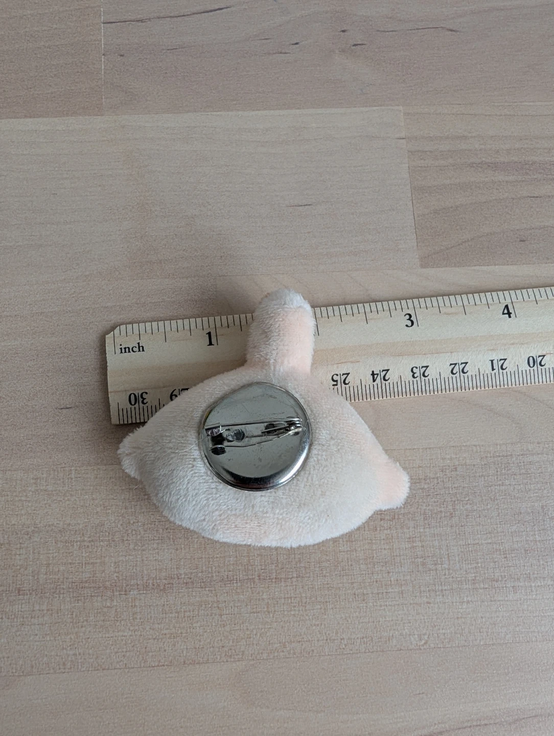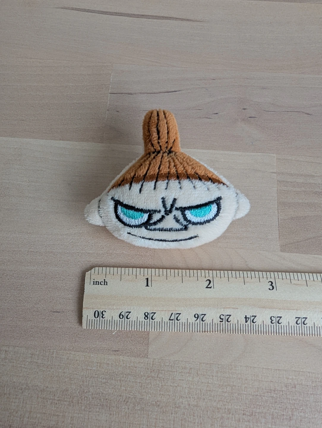 This is a plush badge featuring a Moomin character. It has a metal pin back for attachment. Measures about 2 inches tall.