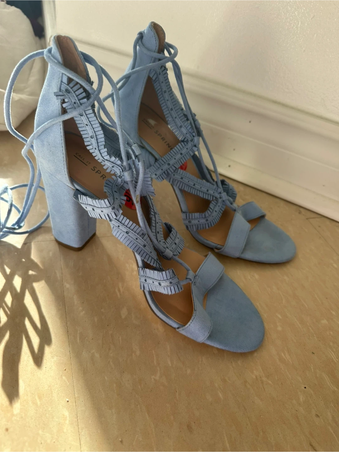 Selling a pair of Call It Spring heels in size 9.5. They are a beautiful light blue colour and feature a unique fringe design.