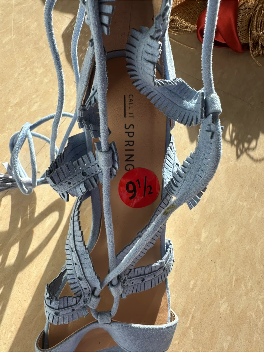 Selling a pair of Call It Spring heels in size 9.5. They are a beautiful light blue colour and feature a unique fringe design.