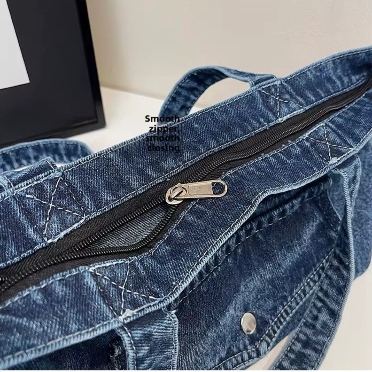This classic tote bag is made from durable denim material. It features a handy front pocket and a secure zipper closure. It's spacious enough for everyday essentials!