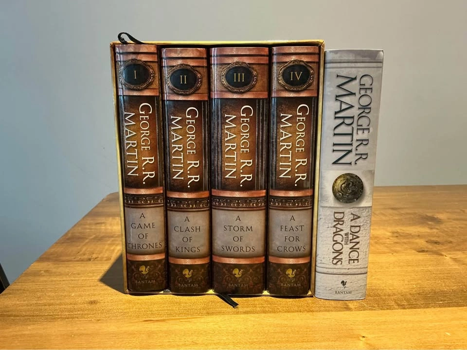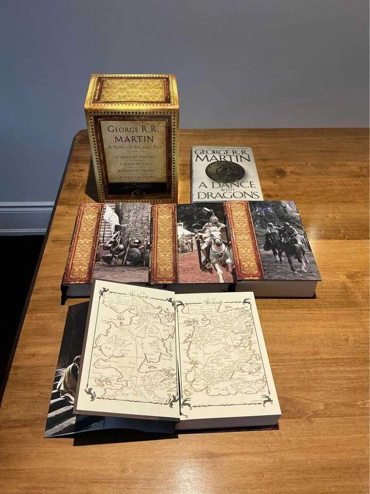 15George R.R. Martin – A Song of Ice and Fire Hardcover Box Set (Books 1–4) + Bonus A Dance with Dragons. YouTube video: https://youtu.be/D2Ej8RokCgU This is the 2011 Bantam HBO tie-in hardcover box set (ISBN 978-0-307-29213-1), originally released as an Amazon exclusive. It includes the first four volumes of George R.R. Martin’s A Song of Ice and Fire in matching jackets and slipcase: 1. A Game of Thrones 2. A Clash of Kings 3. A Storm of Swords 4. A Feast for Crows Condition is very good overall: the slipcase shows minimal wear; the books are clean and tightly bound. Other sellers currently offer this set on EBay for $200 US. I offer my set for $200 CAD. Bonus: A Dance with Dragons (Book 5, Bantam Books 2011, ISBN 978-0-553-80147-7), 6th printing, also hardcover, in very good condition. This volume was published separately and is not part of the box set. This set is available for pickup only at the Toronto Coxwell subway station.