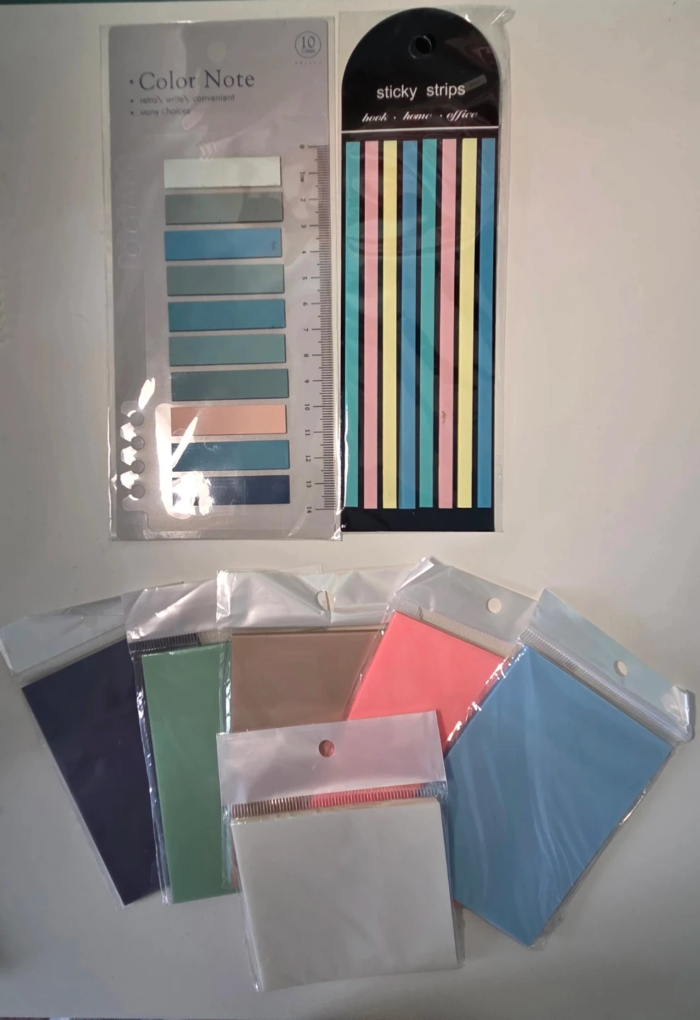 Set of colorful sticky notes and translucent sticky paper to note take on. Includes shades of blue, pink, green, tan, and cream. Perfect for creative projects and annotating.