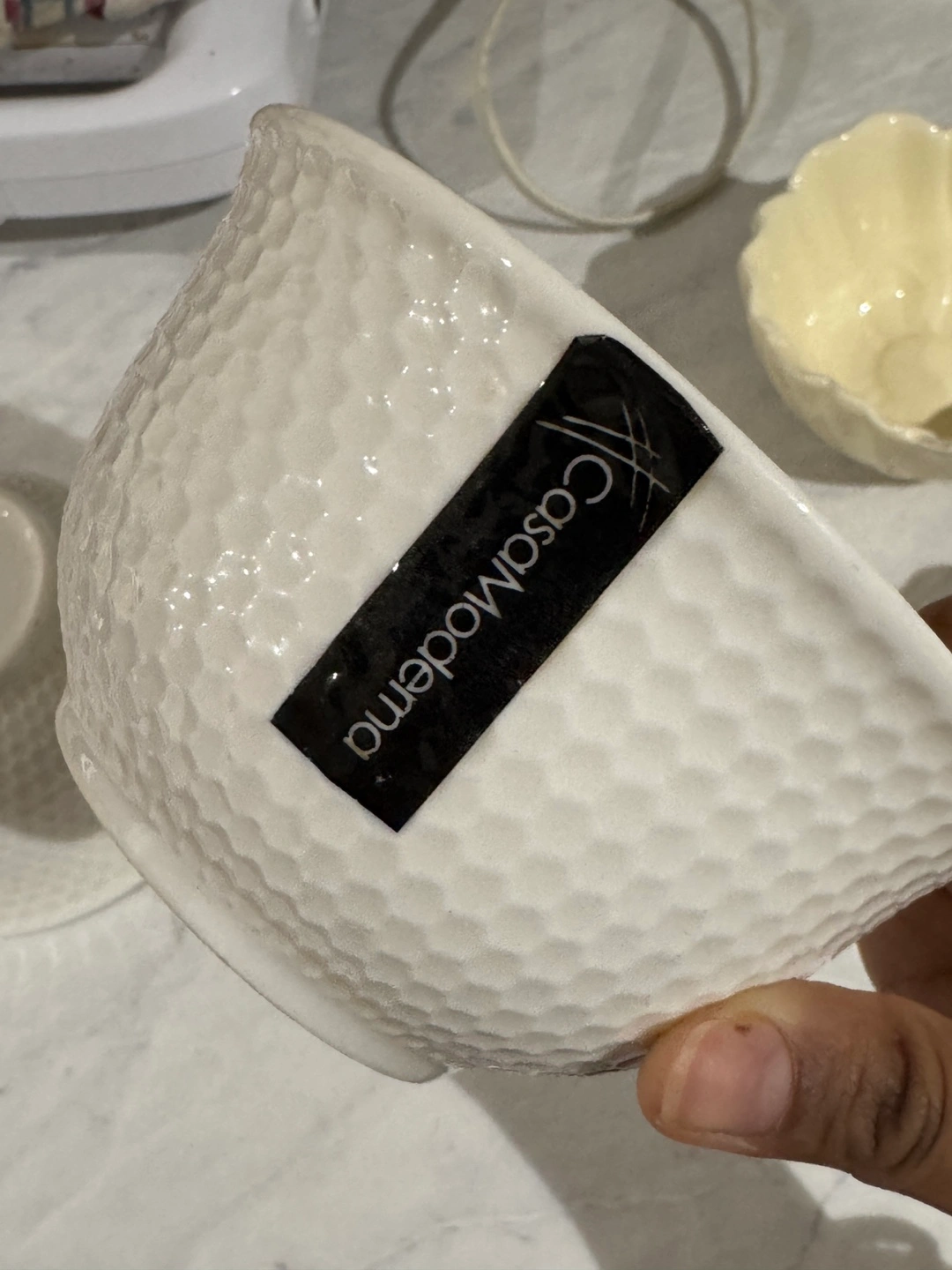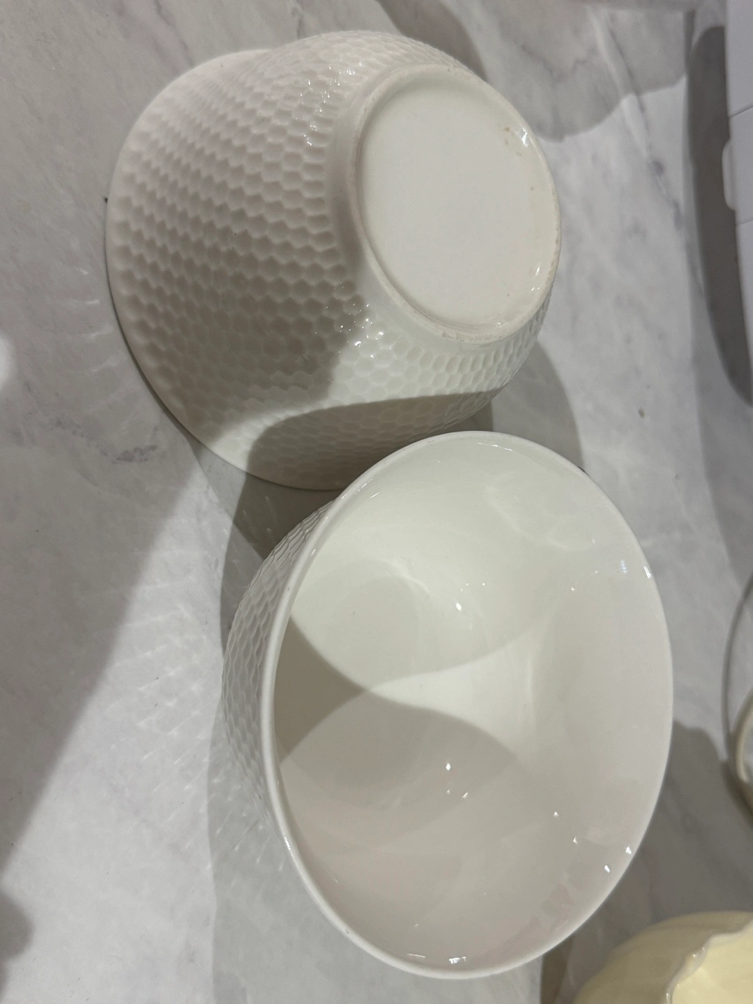 Eight ceramic bowls. Six smaller bowls with ruffled edges in three colours: pale pink, cream, and white. Two larger textured bowls. Excellent condition.