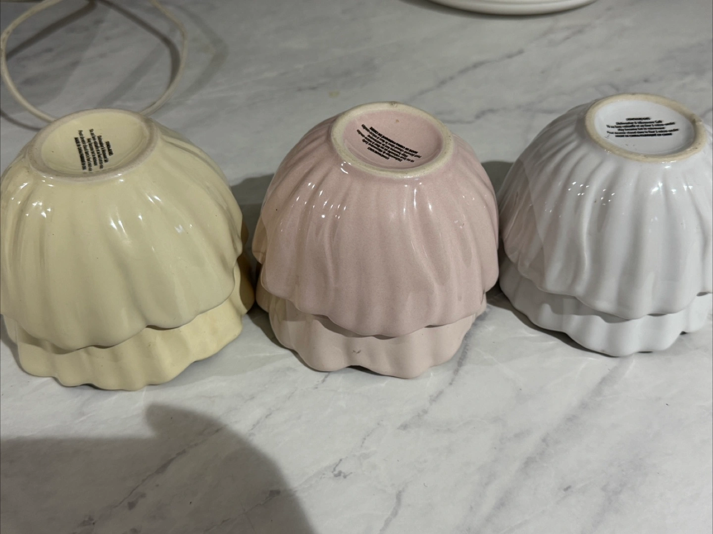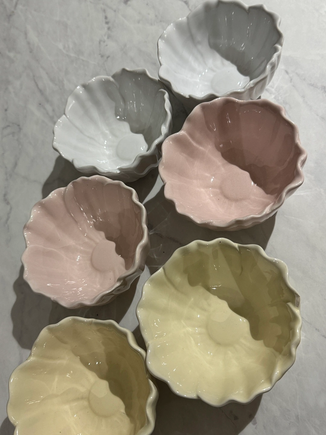 Eight ceramic bowls. Six smaller bowls with ruffled edges in three colours: pale pink, cream, and white. Two larger textured bowls. Excellent condition.