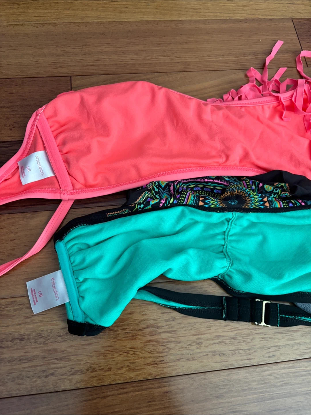 A collection of four bikini pieces including 3 tops and 1 bottoms. One pink /coral fringed top is size L/G. A teal bikini top is size L/G. A patterned bikini bottom is size XL ..A blue bikini bottom is size L/G