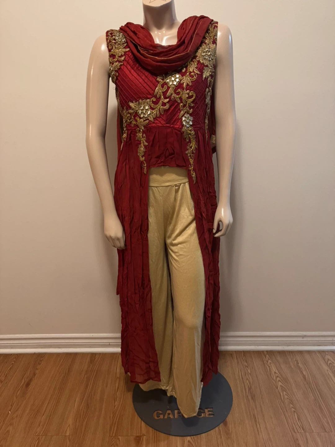 Stunning sleeveless red maxi dress adorned with intricate gold embroidery and sequins. Comes with a pair of matching gold palazzo pants. The dress features a flowing overlay with ruffled textures and a chic cowl neck detail. Great for special occasions!