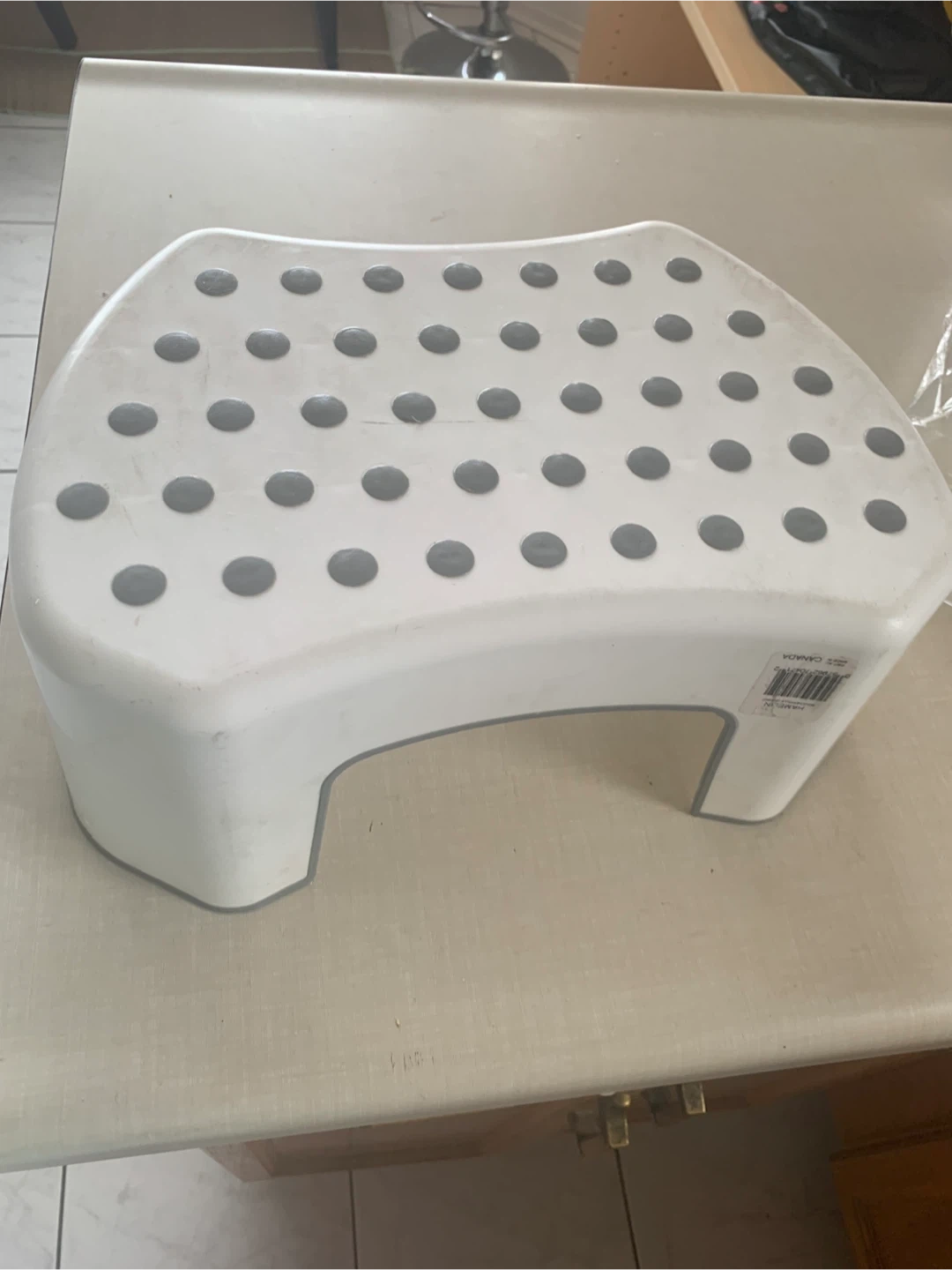 This white plastic step stool offers a secure, elevated surface. It's designed with a textured top for better grip. A great addition for reaching higher shelves or assisting with bathroom use!