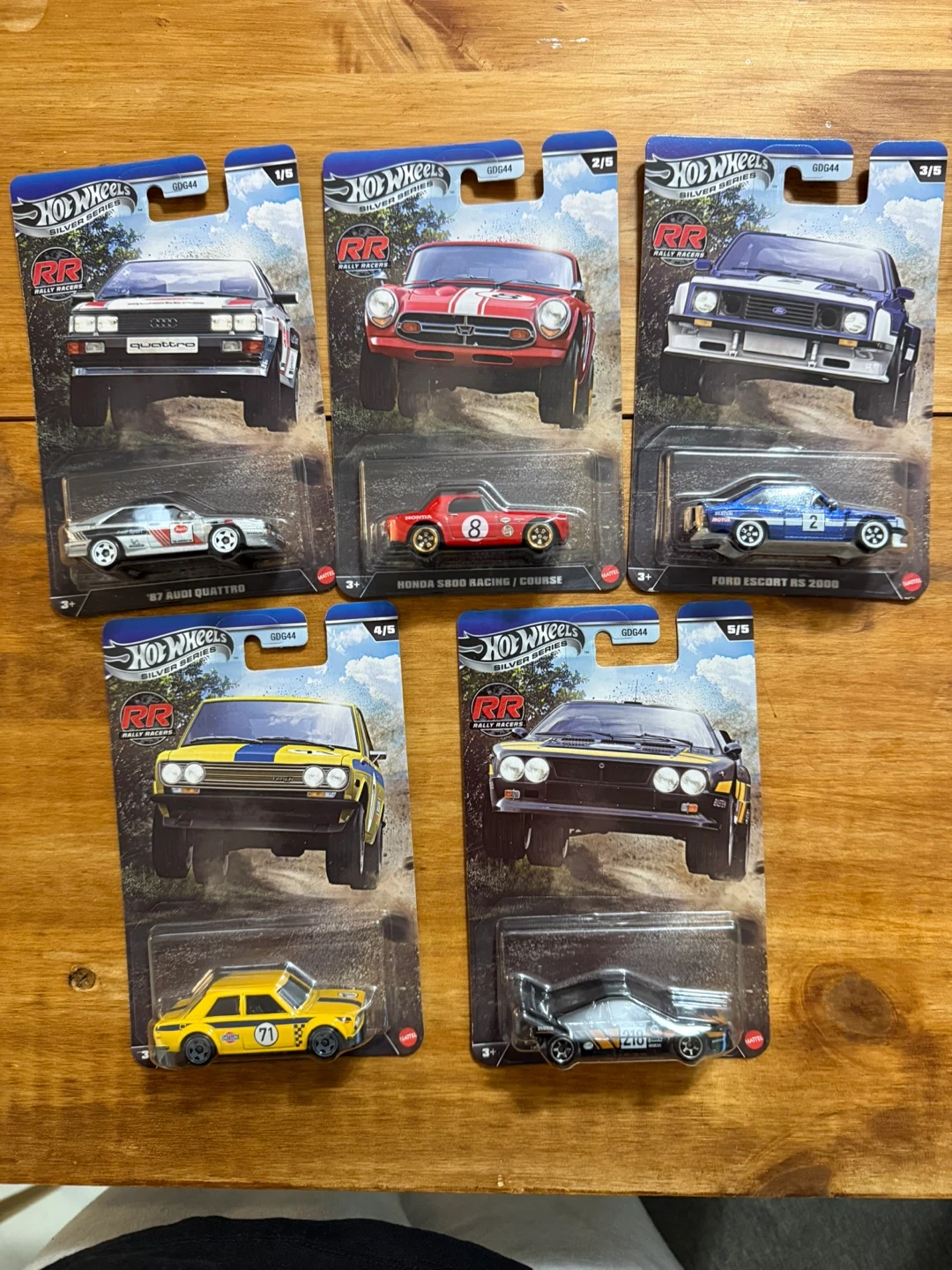 Hot Wheels Silver Series Rally Racers collection. Includes the '87 Audi Quattro, Honda S800 Racing/Course, and Ford Escort RS 2000. These die-cast cars are from the Rally Racers line. They're perfect for collectors or kids who love rally cars!