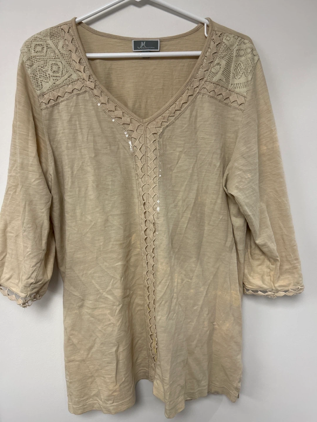 This JM Collection top is beige with a V-neck and sequined lace trim details. It features a flattering centre seam with decorative braiding and delicate crochet trim at the cuffs. It's a comfortable and stylish piece for any casual outfit!