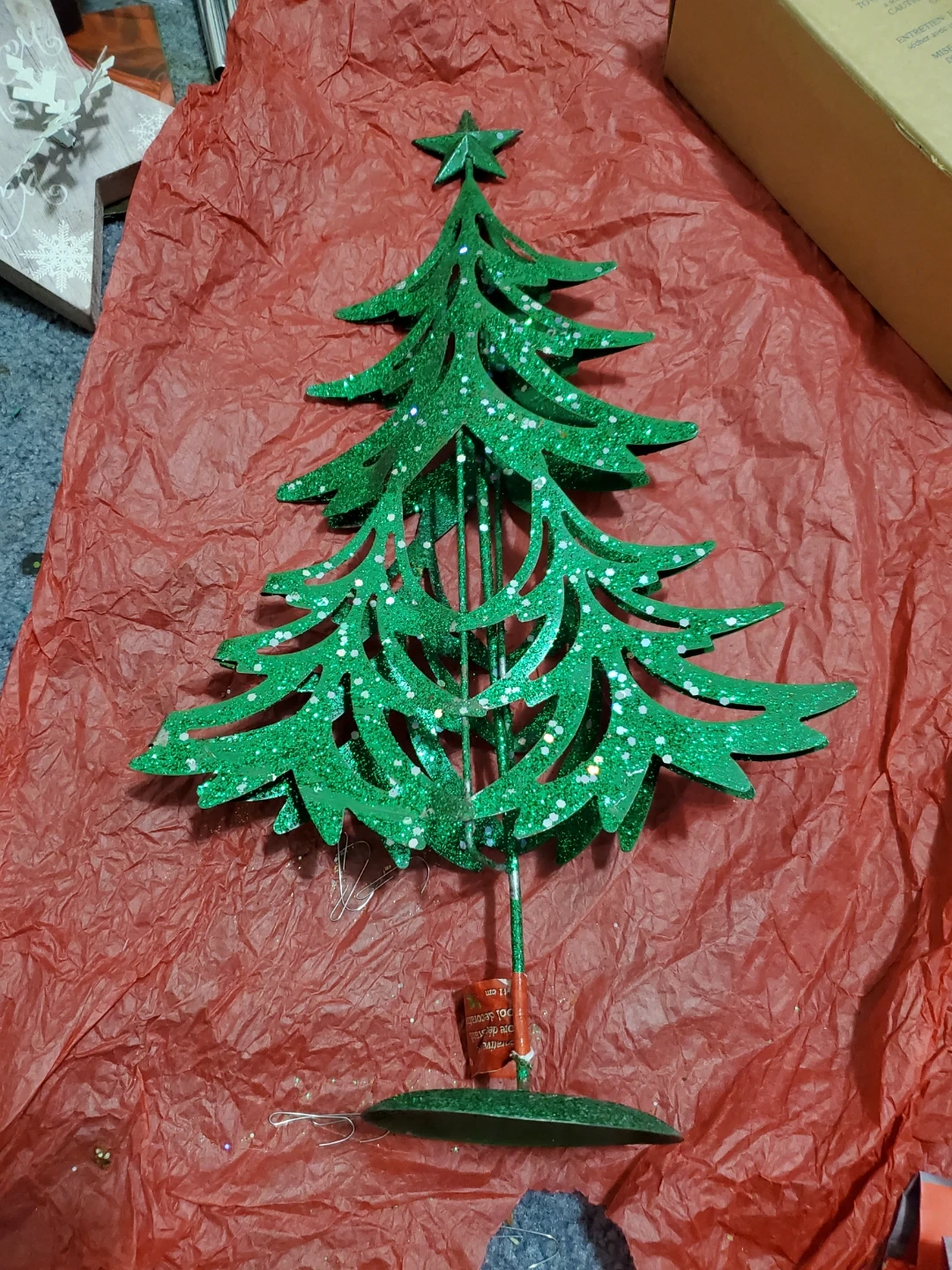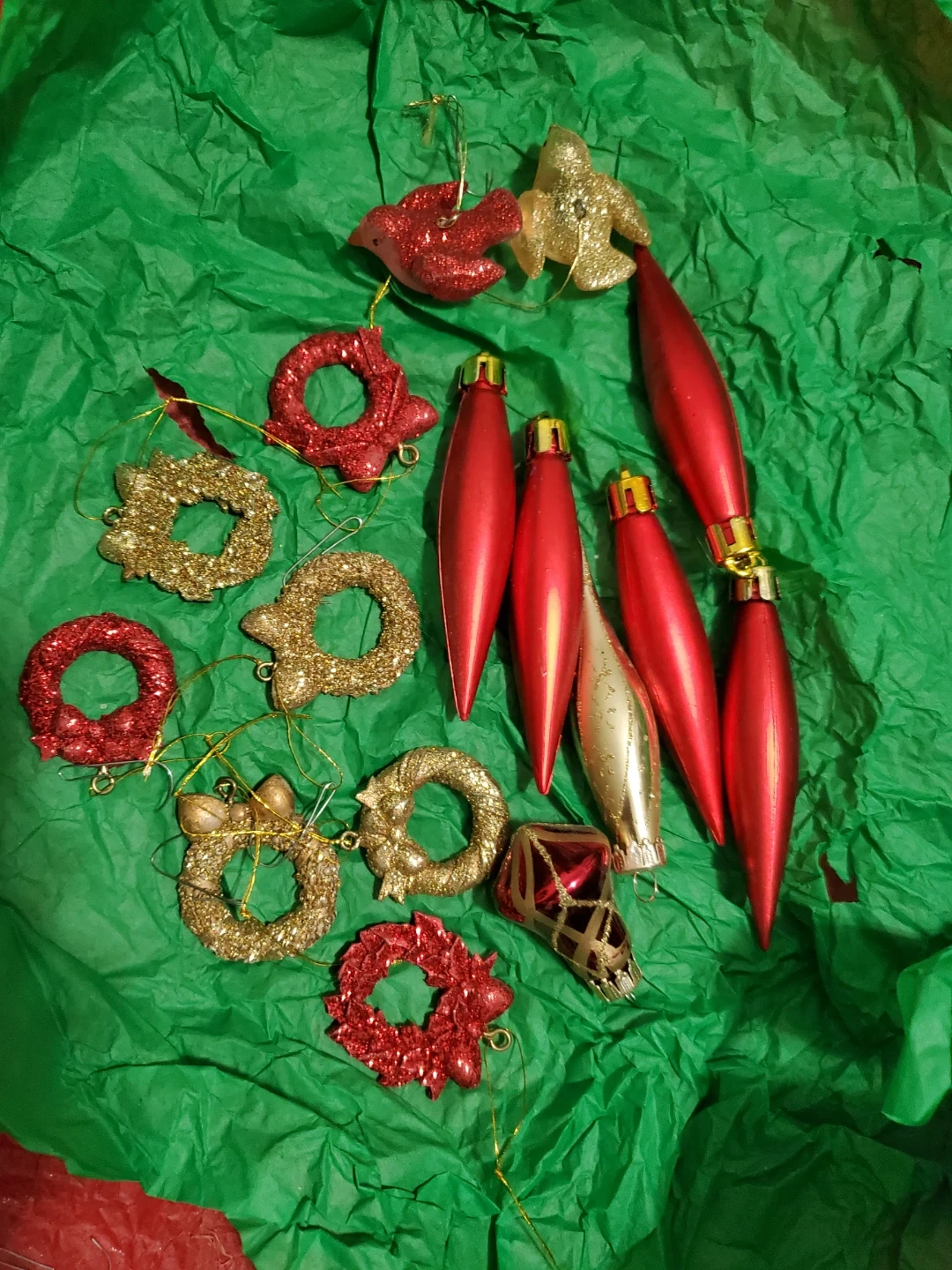 Selling a collection of Christmas ornaments in various shapes and colours, including red, gold, and green. Also included is a green glittery Christmas tree and a colourful star-shaped tree topper. Perfect for adding some festive cheer to your home this holiday season! Cedar pick up.